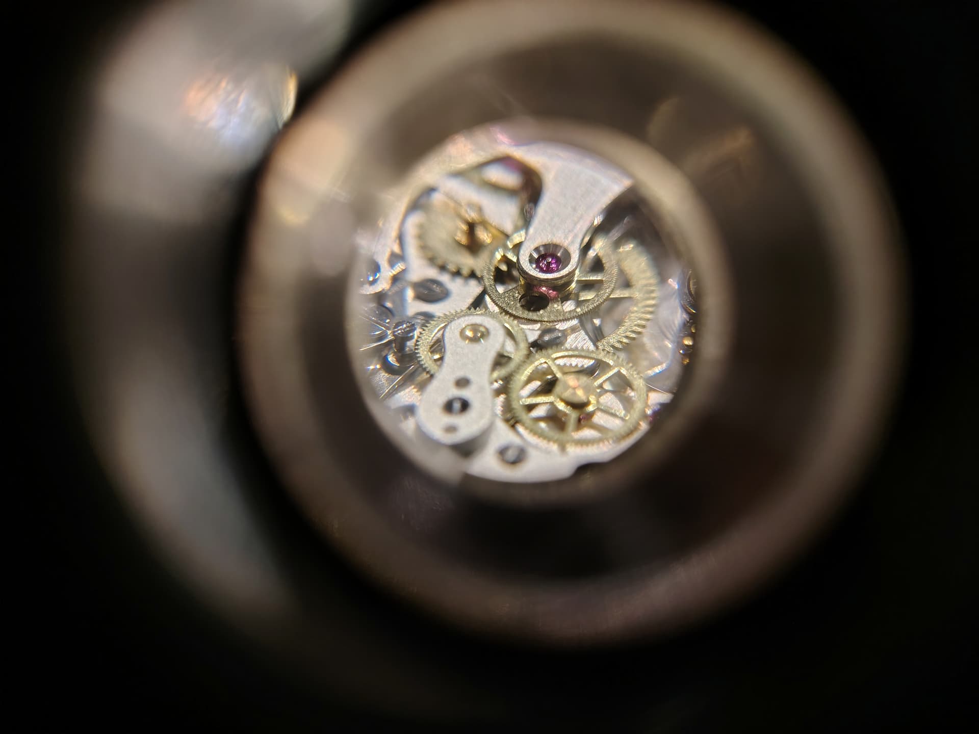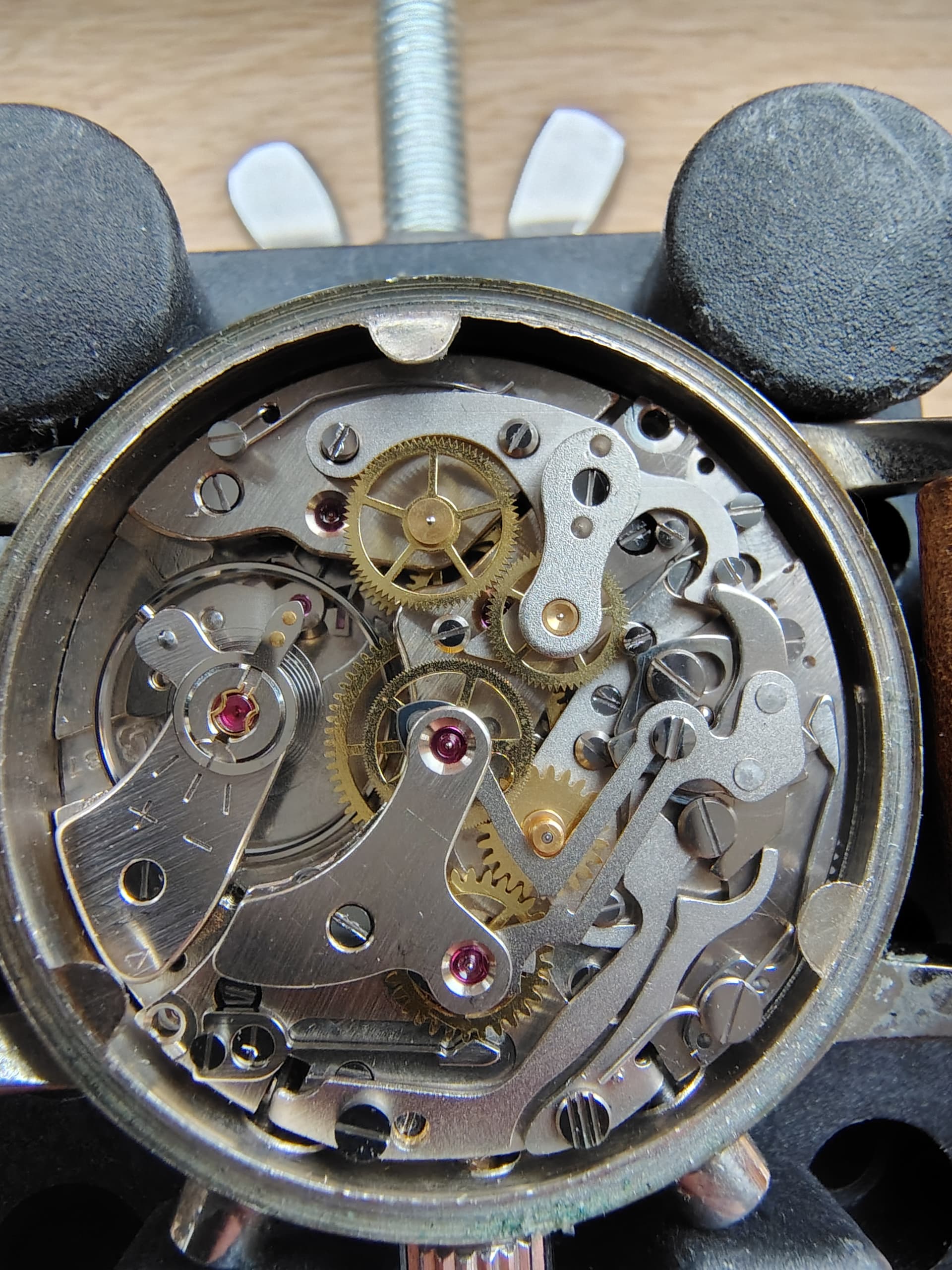 Het gewone seconden rad en het daarbovenop liggende rad draaien goed. Het tussenrad schokkerig, zowel in als uitgeschakeld. De overbrenging op het centrale rad lijkt ook te slippen. Blijkbaar erger tegen de 45 seconden tot aan 5 over…