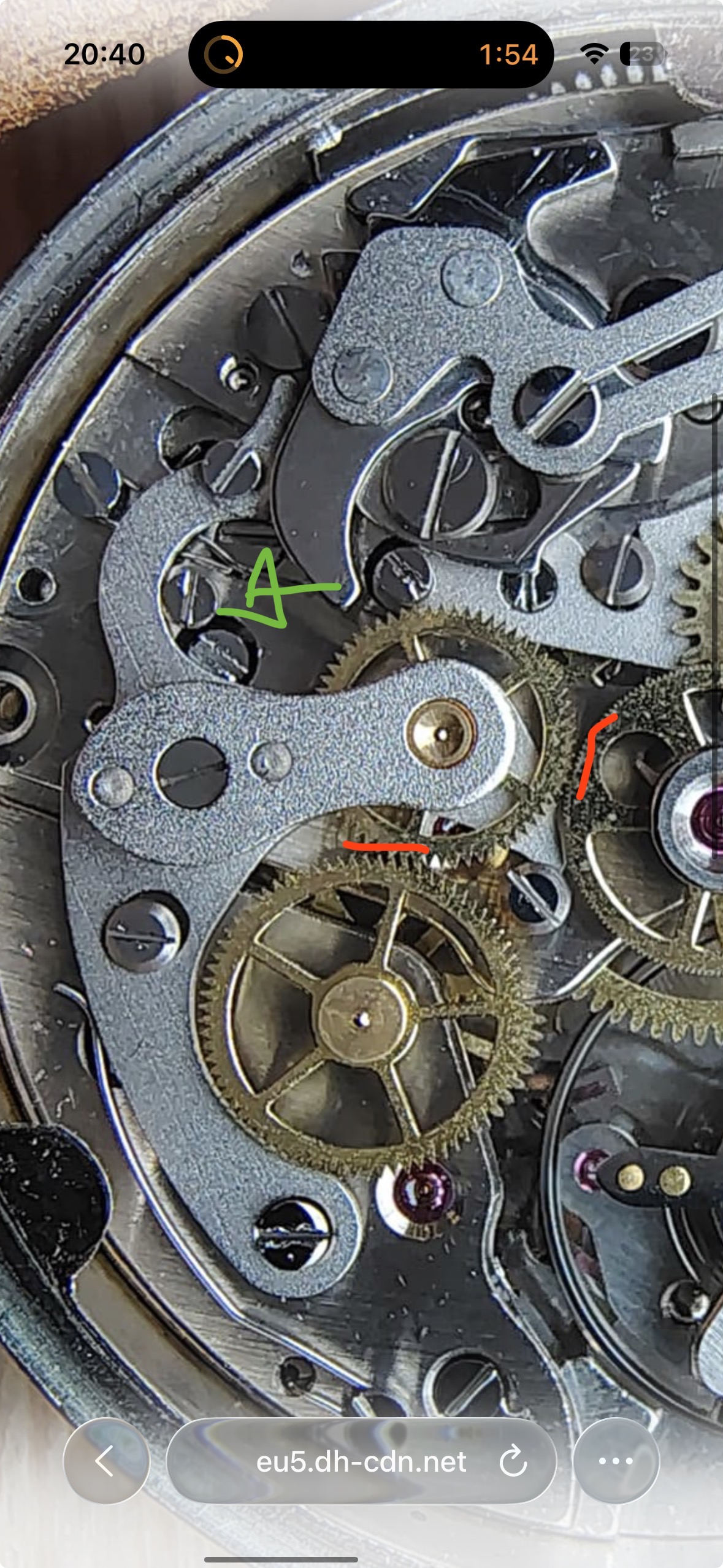 Er vanuitgaande dat het opliggende rad welke direct de decentrale secondewijzer volgt de juiste is in de juiste diameter en de centrale secondewijzer volgt niet goed dan is waarschijnlijk de ingrijping van het tussenrad niet diep genoeg (zie rood).