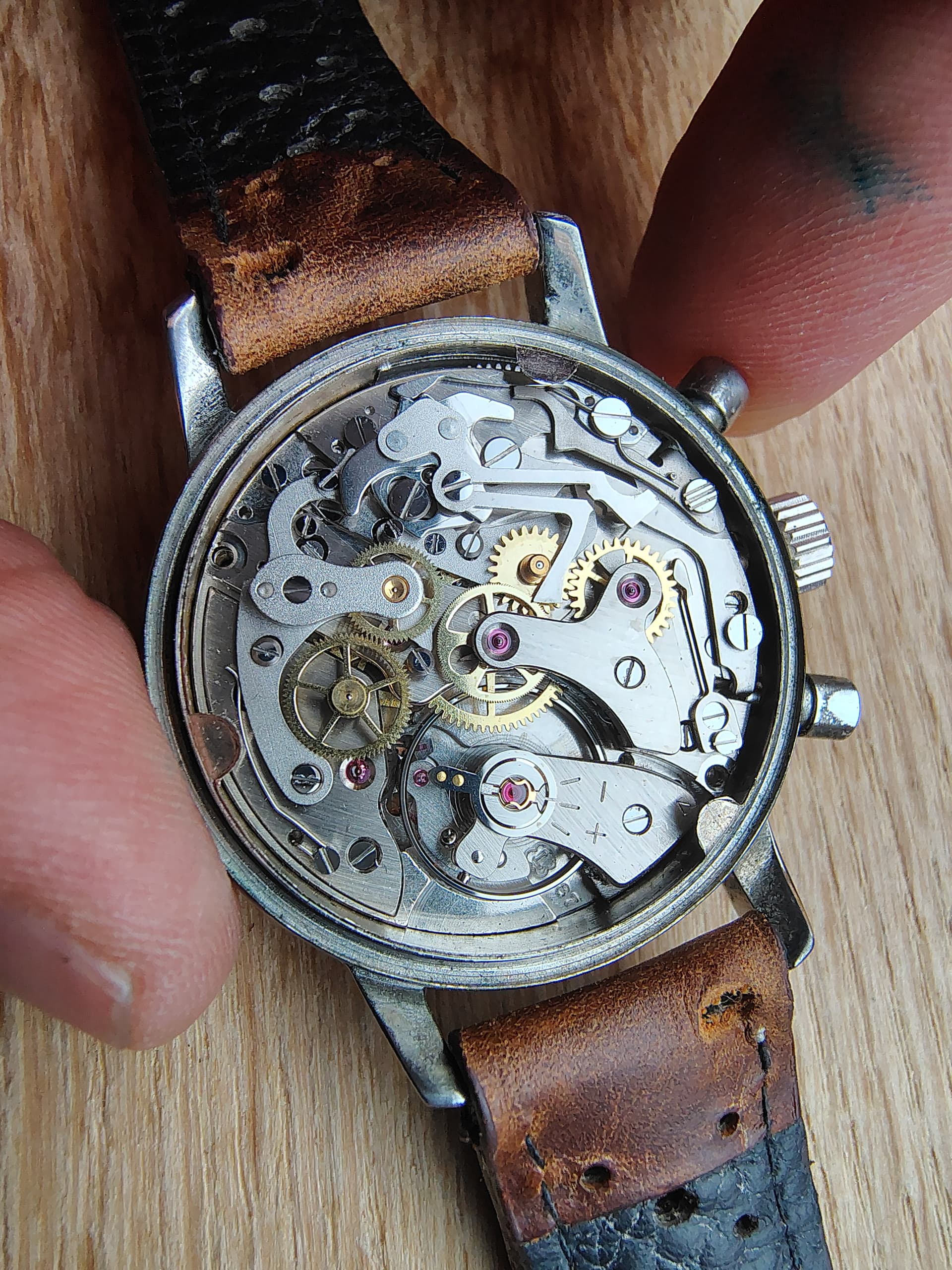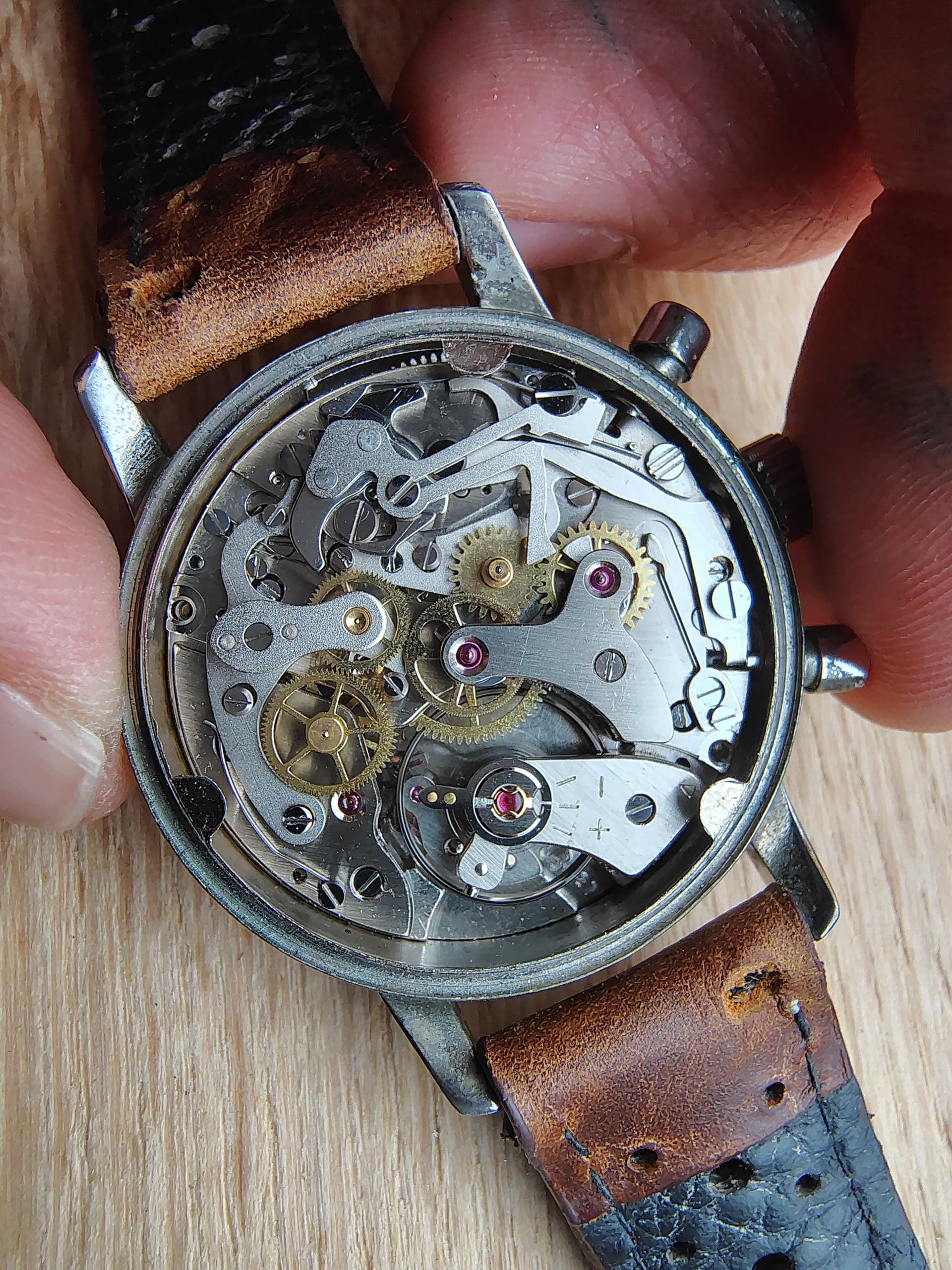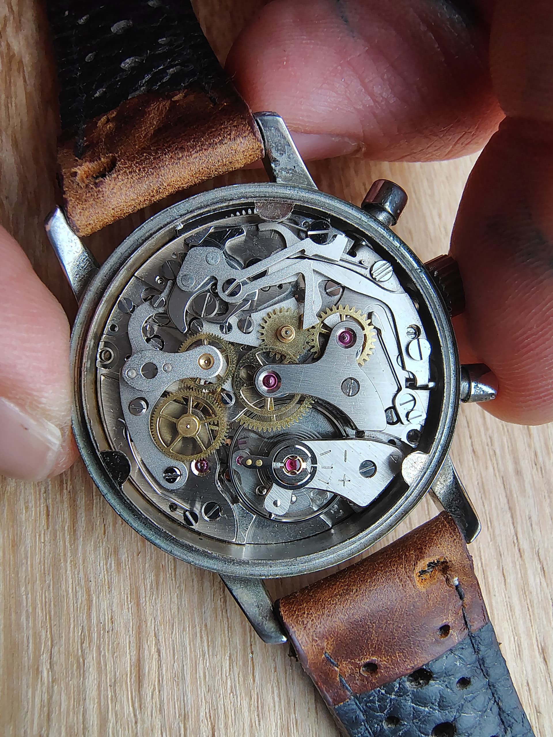 De grote seconden wijzer van mijn Pyl Chronograaf met Landeron 187 kaliber loopt langzamer dan de subseconden wijzer.