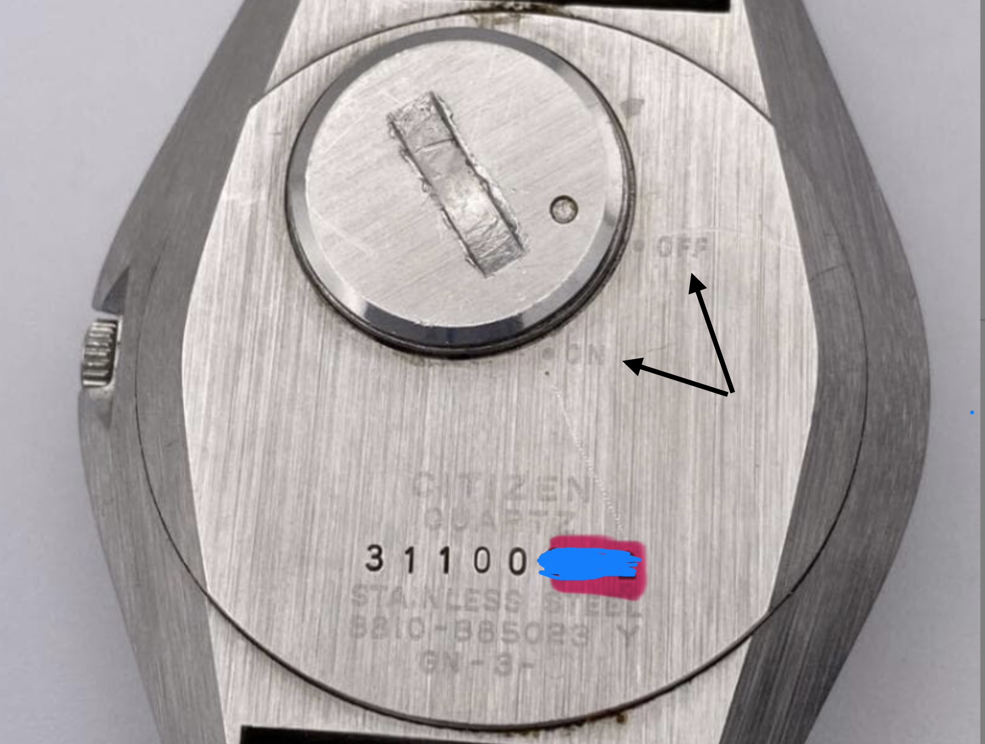 Dit horloge is een vintage Citizen Quartz 8810-885023, een zeldzaam en historisch model uit de vroege jaren '70. Het is een van de eerste kwartshorloges van Citizen en maakt gebruik van een ongebruikelijk hybride uurwerk met een balanswiel dat op een zeer hoge frequentie van 16Hz draait. From Japan From Japan +2 De belangrijkste kenmerken van dit specifieke model zijn: Uurwerk: Een vroege kwarts/elektronische hybride (8810 kaliber) met een “slapende” secondewijzer. Ontwerp: Een roestvrijstalen kast met een kenmerkend batterijdeksel aan de achterkant, gemarkeerd met “ON/OFF” indicaties voor de batterijstatus. Periode: Geproduceerd rond 1973-1974. Identificatie: De achterkant van de kast toont het modelnummer 8810-885023 en de code GN-3-S. Dit model is geliefd bij verzamelaars vanwege de overgangstechnologie tussen mechanische en moderne kwartshorloges.