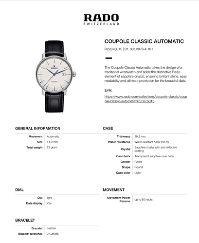 Ik heb zelf een Rado Coupole waar ik zeer tevreden over ben. Zie