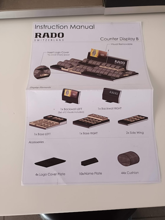grote display: izgs voor 44 stuks horloges op uit te stallen. Modulaire display bestaande uit 4 modulen en 2 achterpaneeltjes. Folder zit er nog bij. Deze heeft hier jaren dienst gedaan maar met het opruimen en afbouwen van de hobby is ie overcompleet geworden. de kussentjes zijn in nette staat, je ziet dat er horloges op gezeten hebben met de jaren, maar ze zijn niet kapot of iets dergelijks, enkel een afdruk van de erop uitgestalde horloges, niet zichtbaar wanneer er nieuwe horloges op uitgestald worden