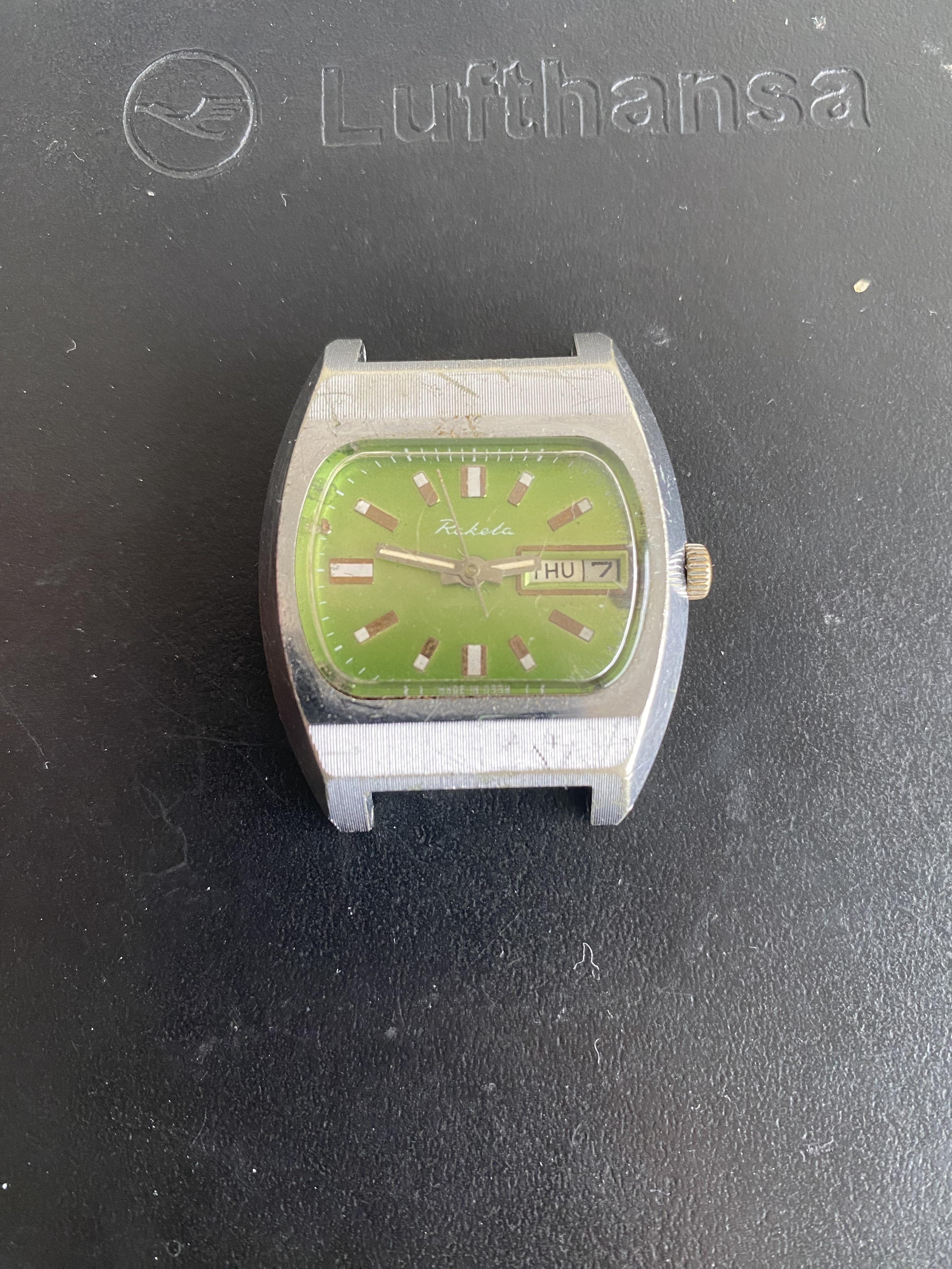 Conditie (krassen, werking etc): Het horloge werkt nog. Kan foto van binnenwerk op vraag doorsturen. Het kan waarschijnlijk een opknapbeurtje krijgen. Zowel esthetisch als mechanisch. Kan een leuk hobbyprojectje zijn. Of gewoon dragen!