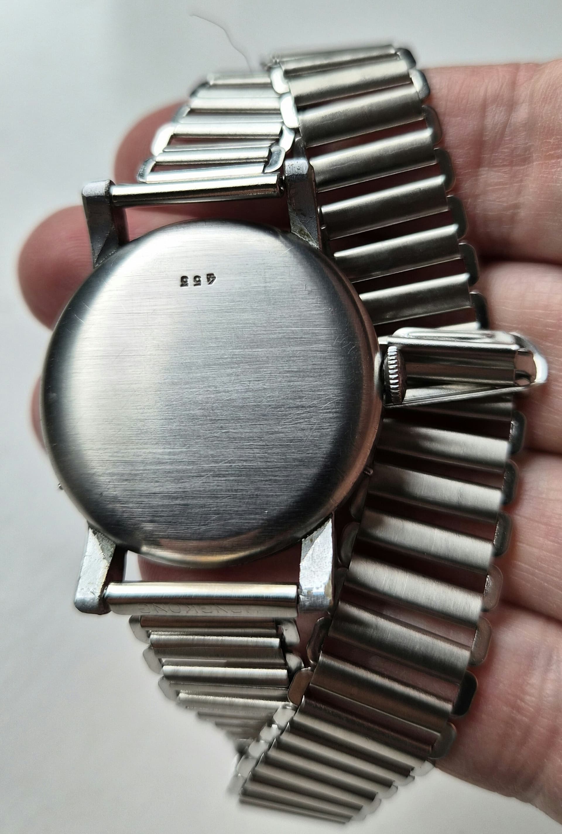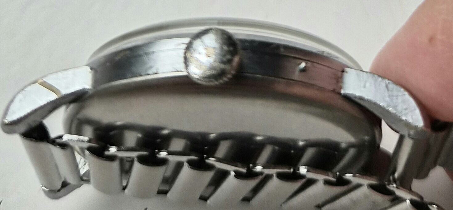 De 35 mm stalen en verchroomde kast heeft mooi gedefinieerde sierlijke lugs en verkeert in vrij goede staat met hier en daar wat gebruikssporen. De kroon en datuminstelknoppen functioneren perfect. De kastachterkant is gesigneerd met “Record”.