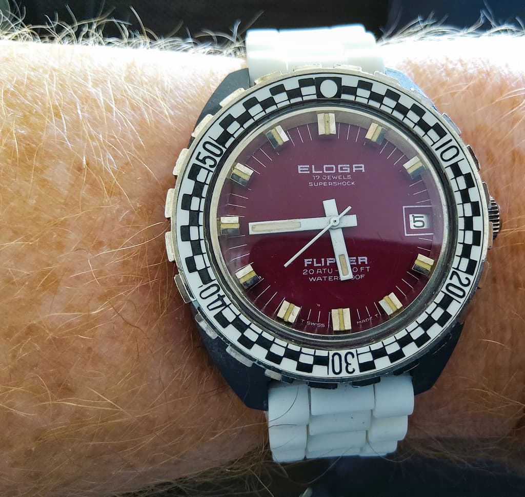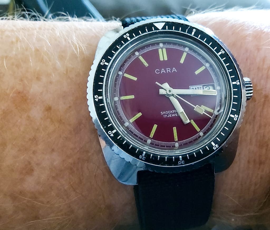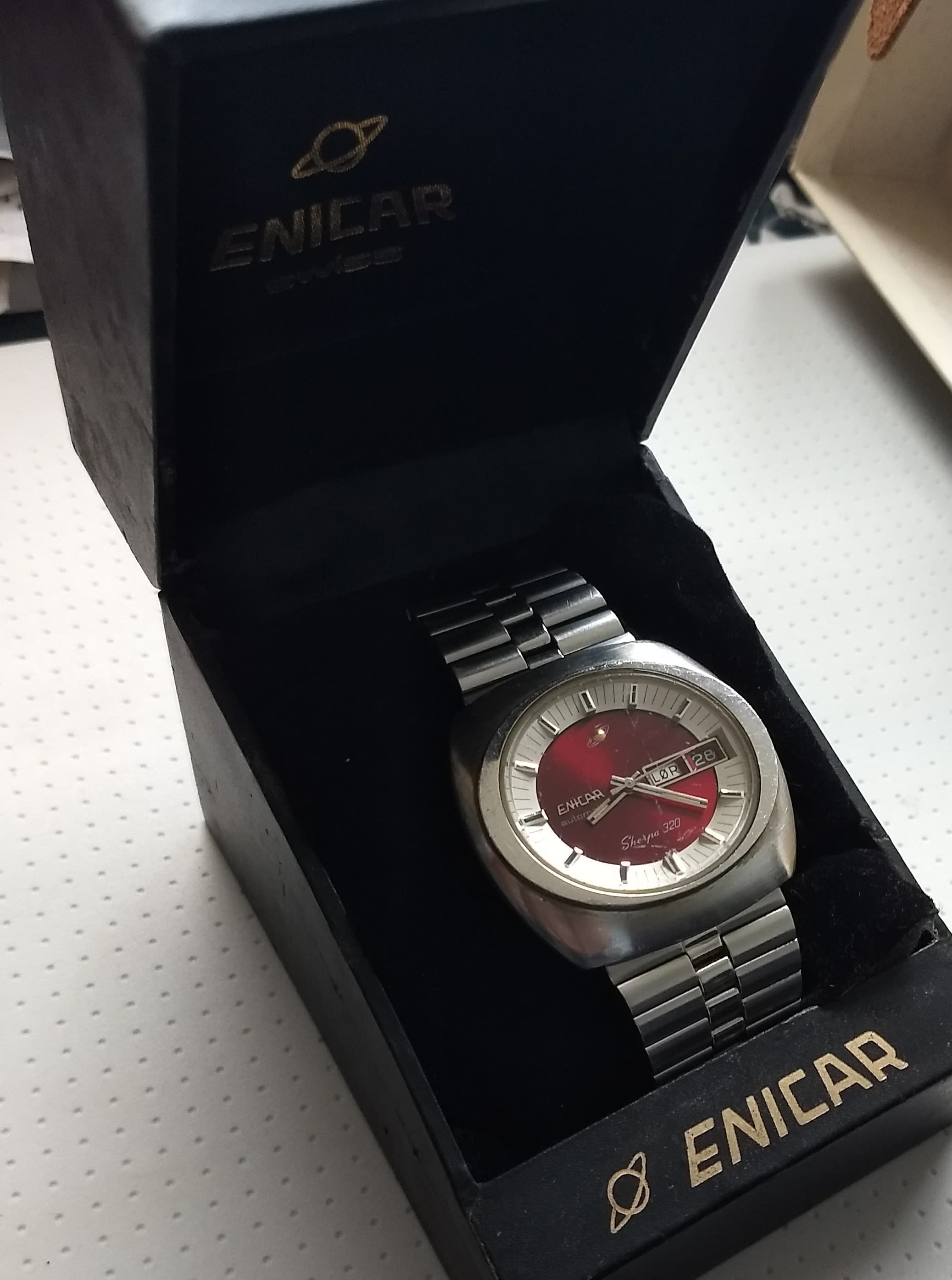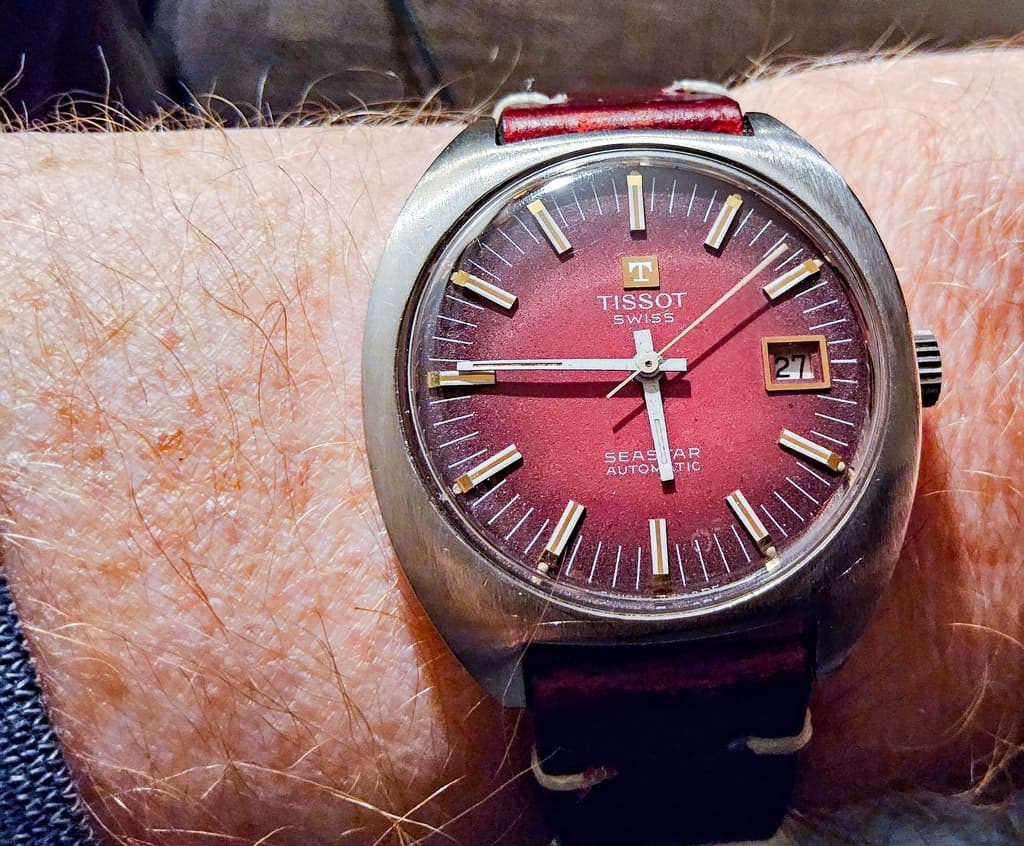 Ziet er ‘kersvers’ uit, en apart zo in vet rood ! 't zou mijn kleur niet zijn om te dragen, maar het oogt wel bijzonder voor Tissot - waarschijnlijk tegengas voor de kleurige Omega’s uit die seventies ![]()