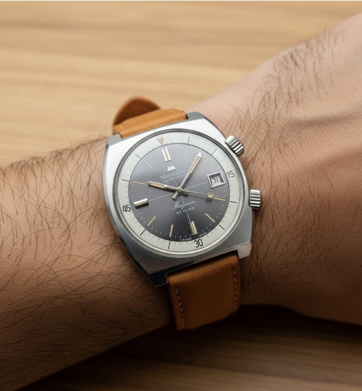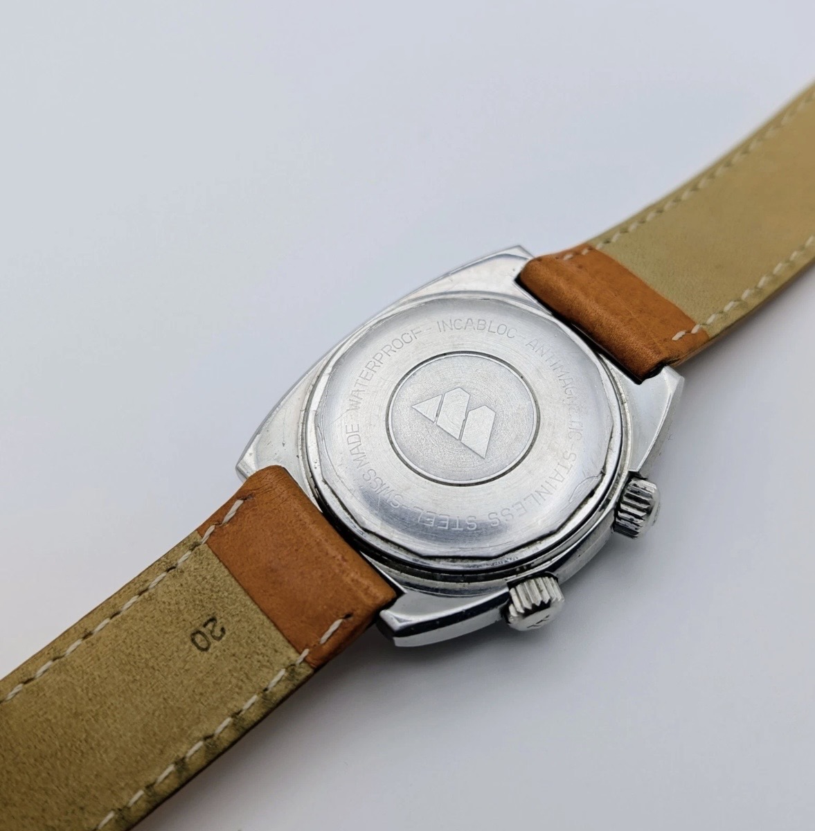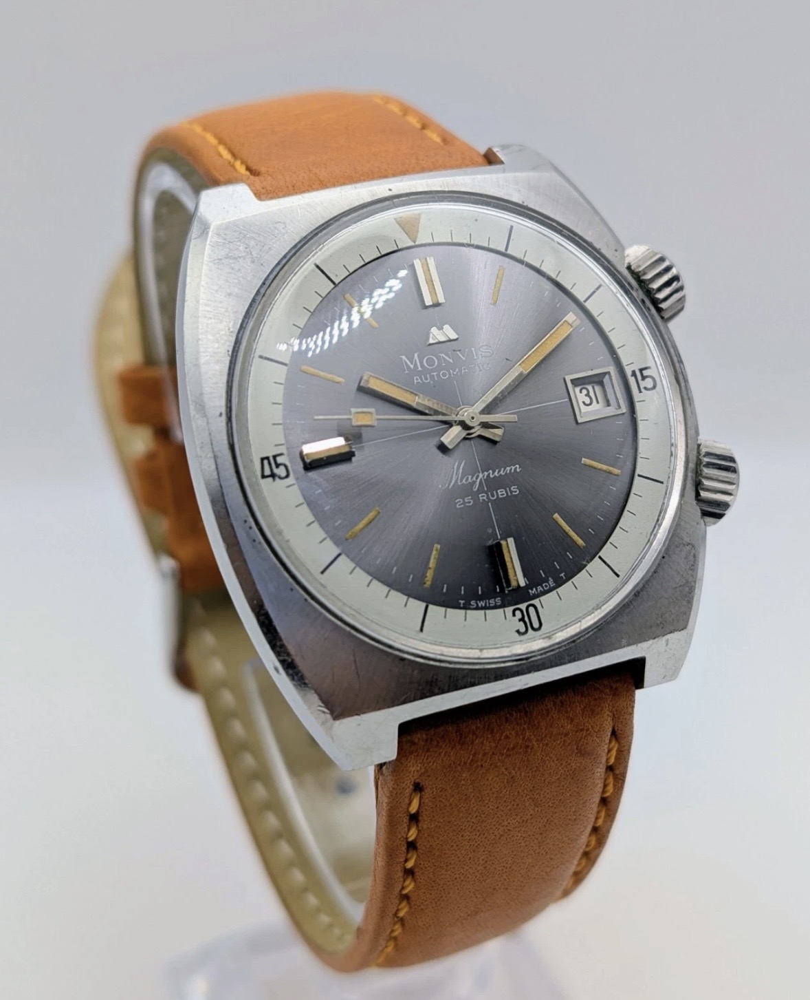 Op het forum stuitte ik op het volgende (jaren 70) horloge van Monvis: