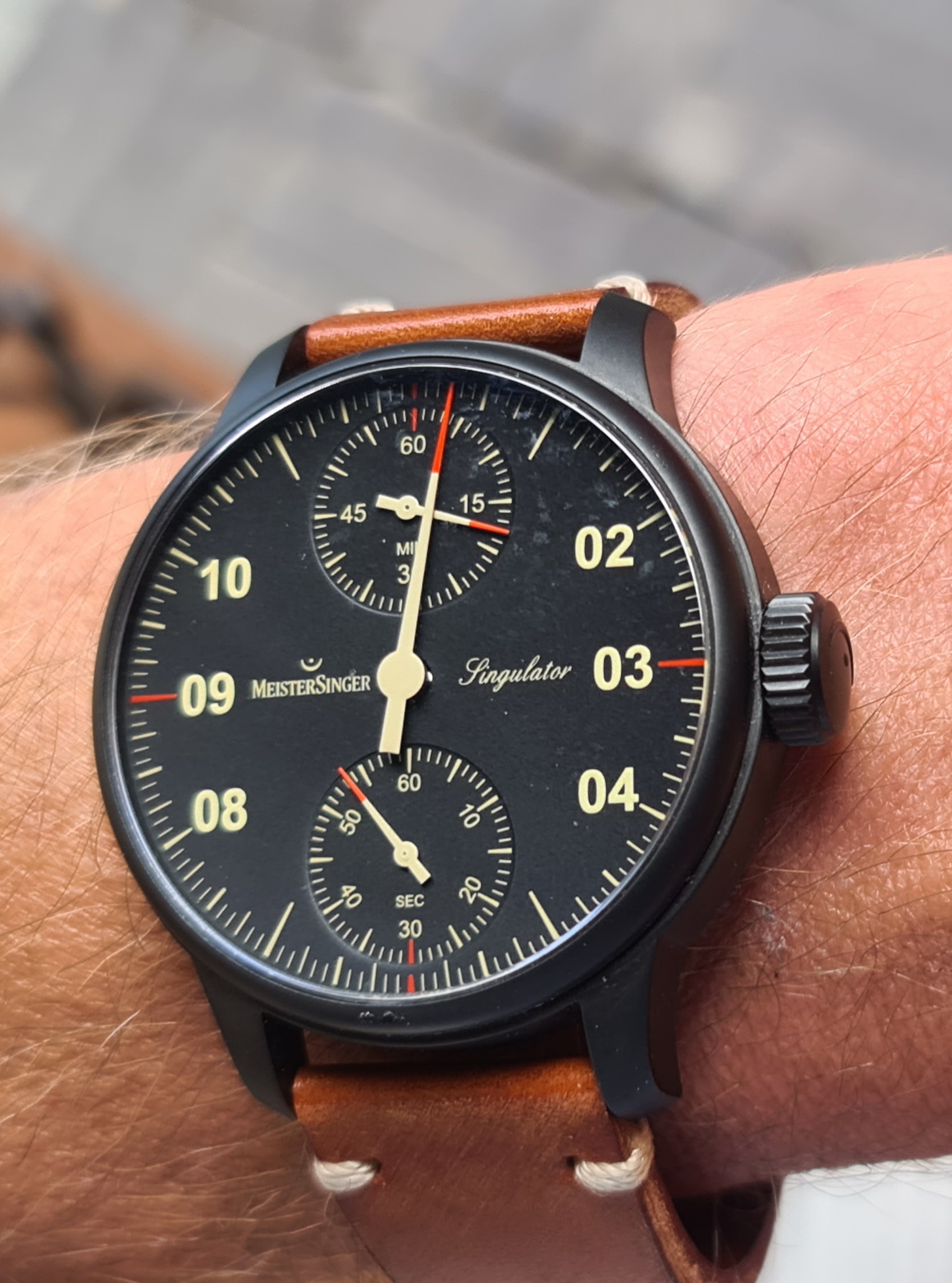 Het is een Meistersinger, dus het principe van één lange urenwijzer waar je de tijd dan in blokjes van 5 minuten verdeeld kunt aflezen.