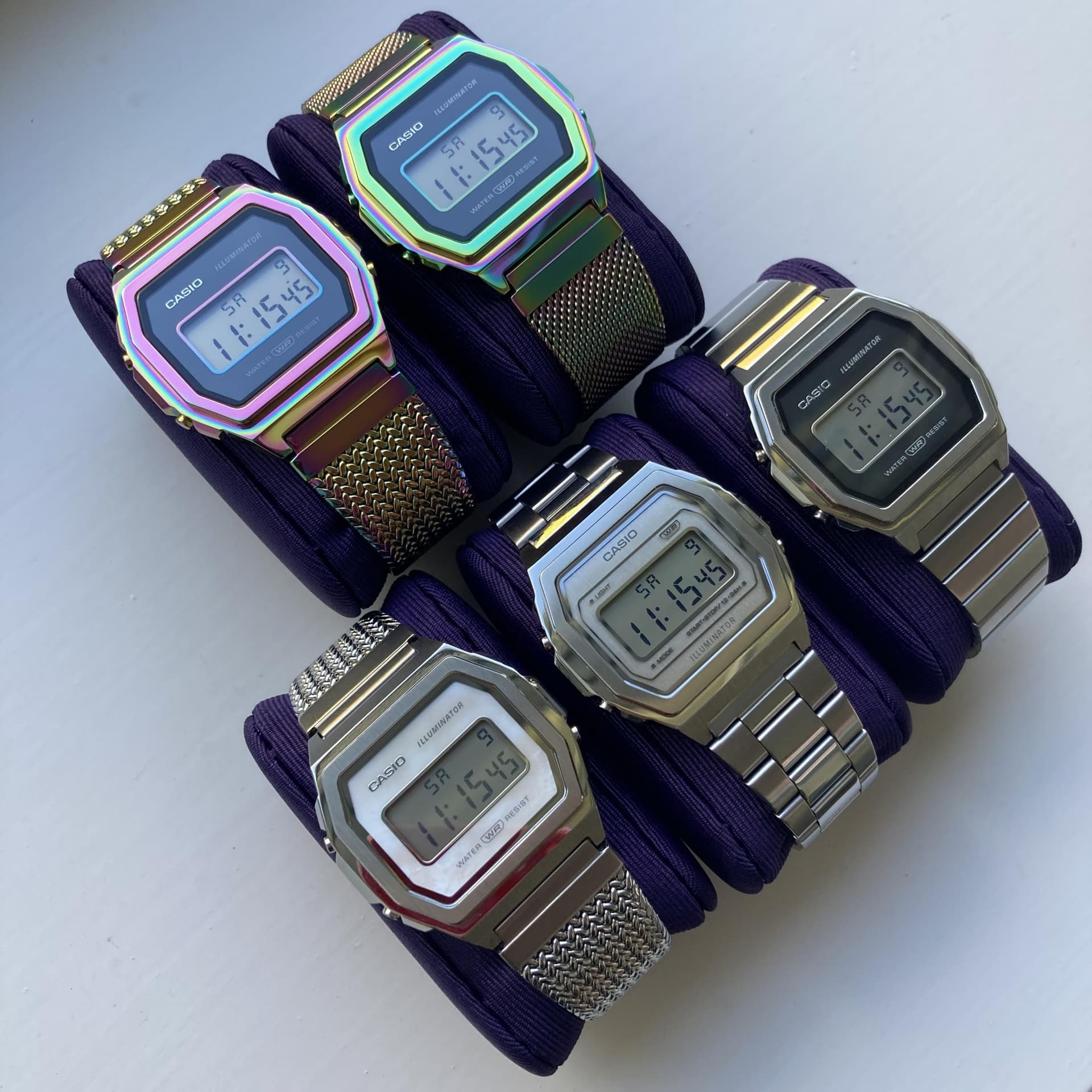 Een stalen casio A-1000 - ongeacht welke uitvoering - geeft de tijd weer, heeft een wekker, timer en geeft licht in het donker.