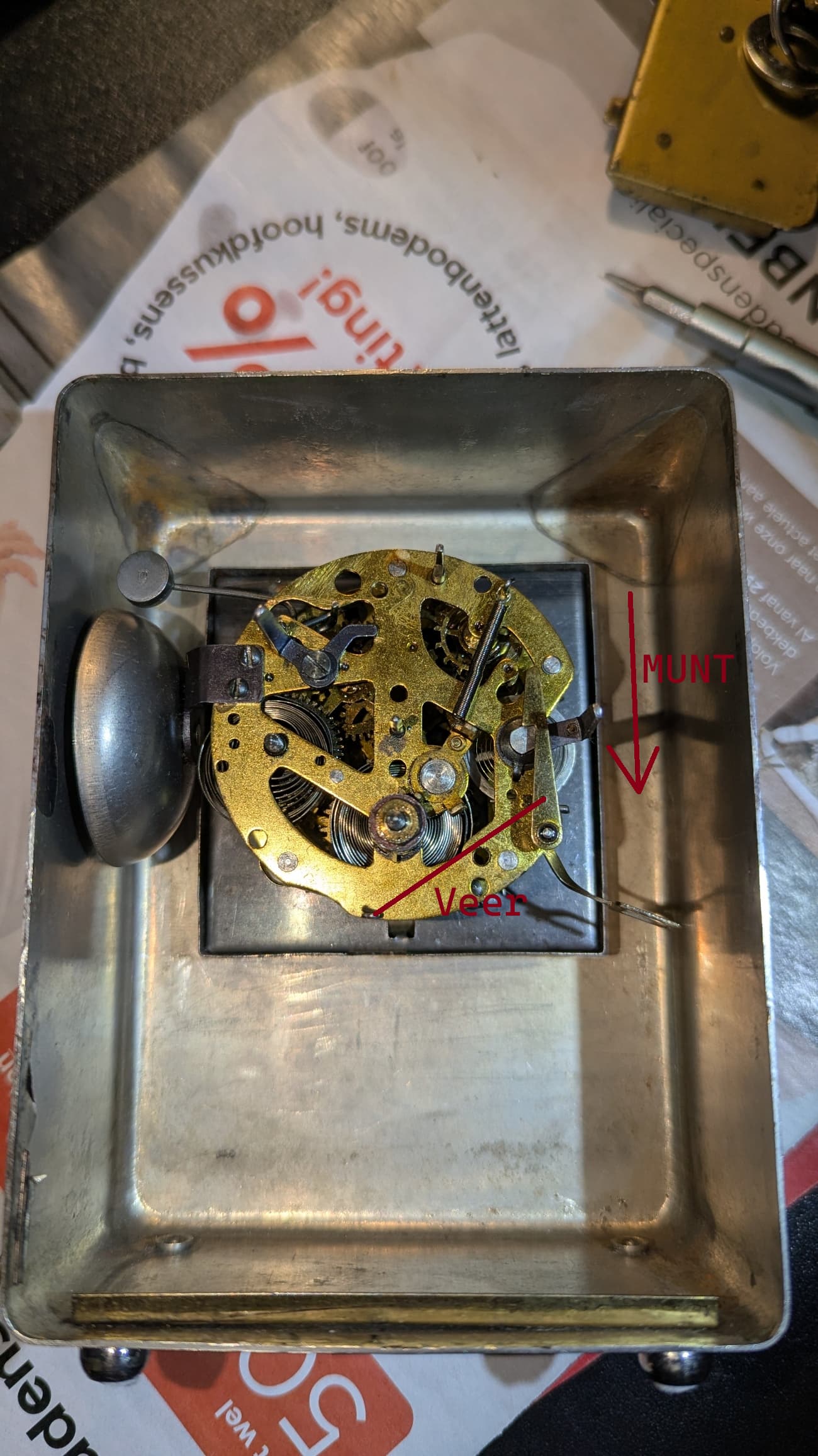 Mijn vader heeft een spaarklok gekocht. Deze liep niet goed. Na het openmaken blijkt dat er een veer mist voor het mechanisme waar de muntjes in worden gegooid. Deze veer zorgt ervoor dat het mechanisme geblokkeerd wordt als de klok opgewonden wordt. Na het ontkoppelen van dit mechanisme loopt het horloge perfect.