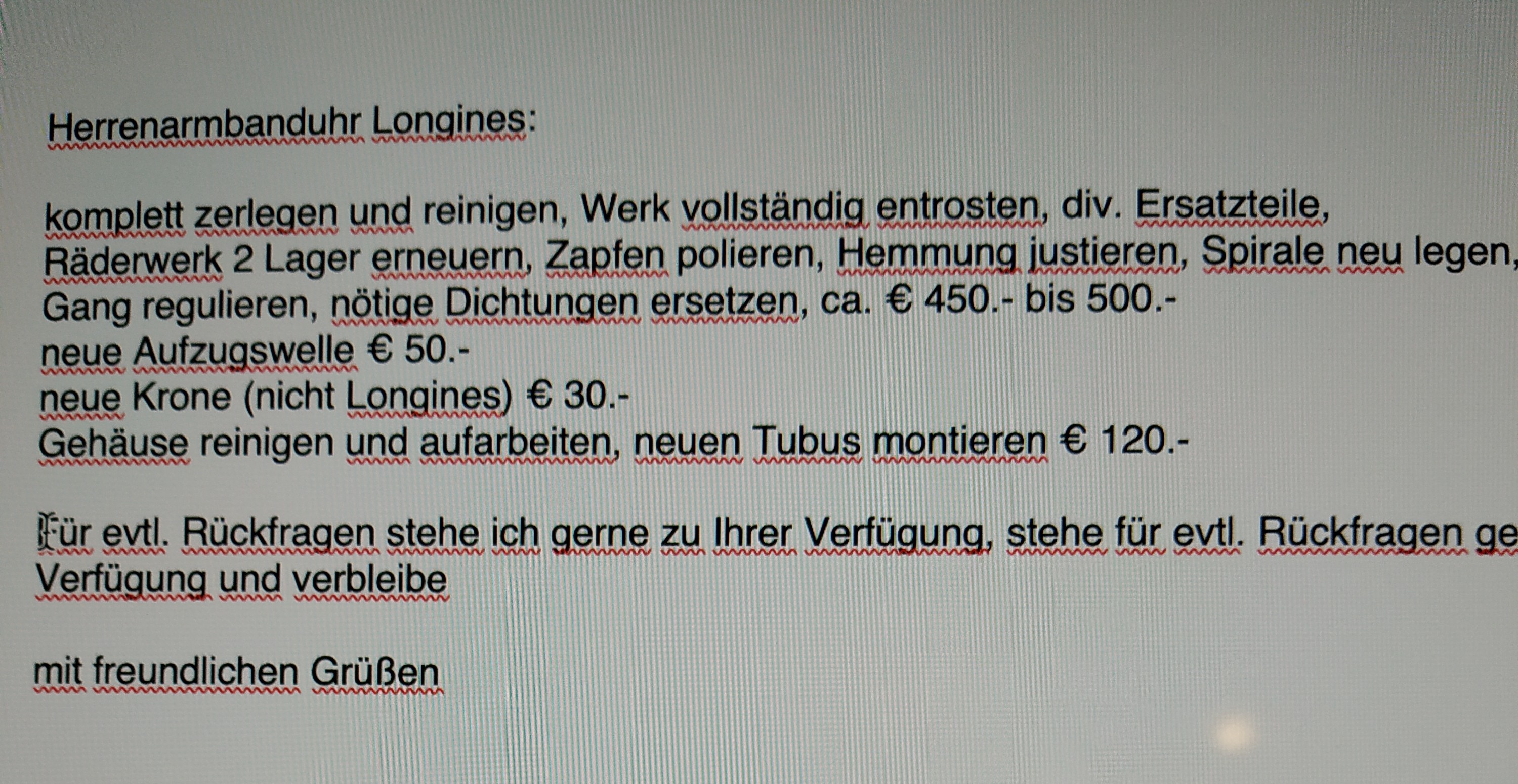 Het vintage Longines horloge van mijn vader is nogal stuk. Ik heb het ter reparatie aangeboden en krijg de onderstaande prijsopgave.
