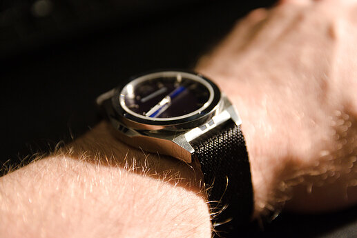 Deze single pass nato’s zijn qua looks en comfort een mooie stap omhoog ten opzichte van het perlon: dichter geweven en iets minder rek. Doordat hier dus minder rek in zit blijft hiermee het geheel beter op z’n plek zitten en draait het geheel veel minder vaak rond de pols. Qua mogelijke kleurvariatie geeft dit ook leuke opties! Zo heb ik een blauw-witte, blauw-rode en zwarte nate geprobeerd. Allen vond ik ze prima staan; waar de rood-blauwe erg speels stond zorgde de zwarte er juist voor dat het geheel er weer meer dressy uit zag. Dit dressy effect was het sterkste wanneer het wat donkerder wordt buiten en de wijzerplaat zicht iets meer koest houdt en meer naar het zwarte toe neigt.