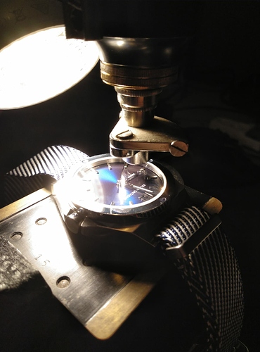 Dit staat grappig genoeg redelijk in contrast met de ietwat (microscopisch) ravelige randen van de wijzers. Ook de stippen op de bezel hebben duidelijk ook al een zwaar leven gehad. De bedrukking is echter wel weer erg netjes! Kortom: erg netjes gezien de prijsklasse! Vette schouderklok voor @Brunmontagne!