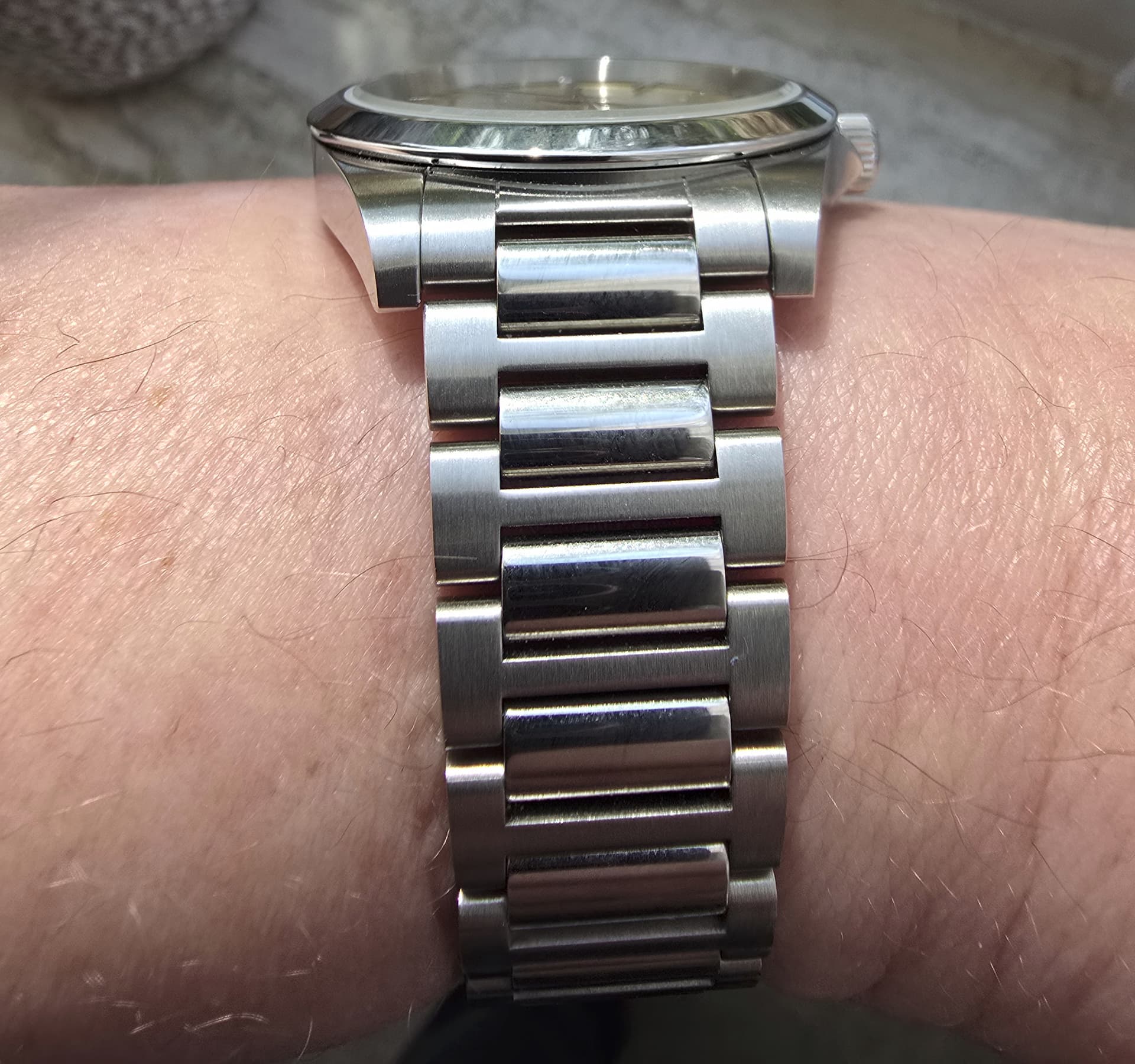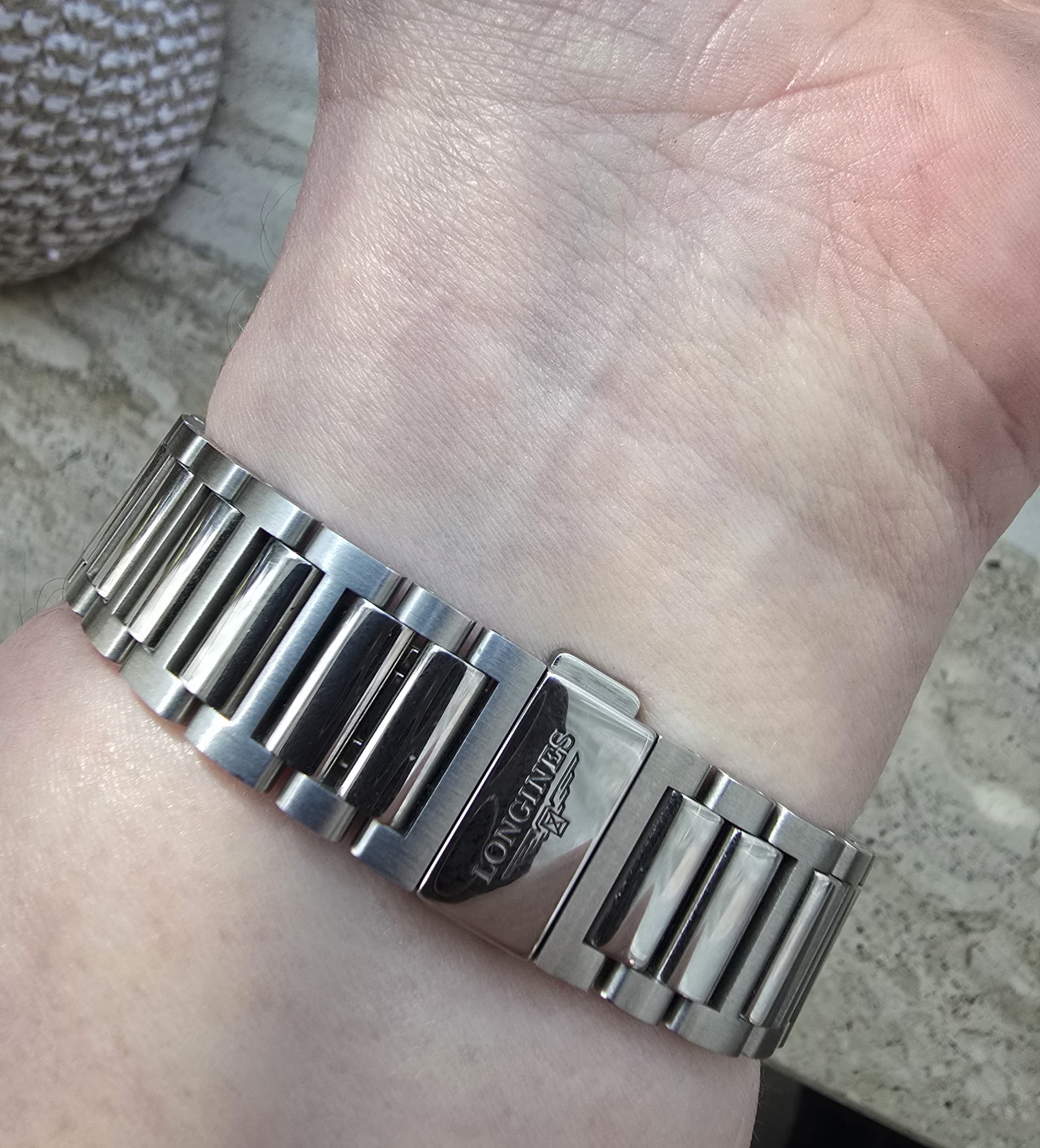 De buitenzijde van de links zijn fijn geborsteld waarbij de midden links hoogglans zijn uitgevoerd. De vlinder sluiting werkt goed, waarbij wel opgemerkt moet worden dat de Longines gemarkeerde zijde als laatste gesloten moet worden. Dit kan niet andersom. De band reduceert mooi wat het totaal slank om de pols laat lijken. Hoewel in mijn geval de passing goed is, is het grootste nadeel van deze band dat geen micro adjusts zijn. Ook moet opgemerkt worden dat schakels middels een pin passend gemaakt moet worden. Geen geschroefde links dus.
