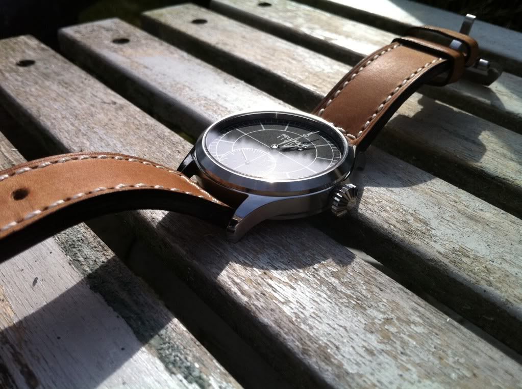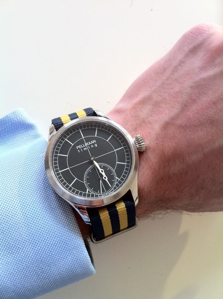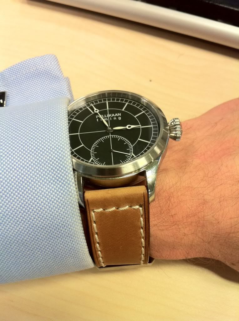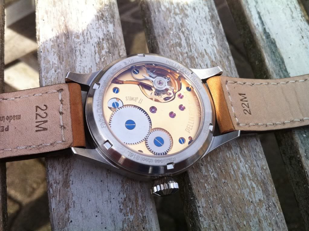 Ik volg het merk Pellikaan al een aantal jaren en ik wilde graag in 2009 al de limited edition van het horlogeforum kopen, was het niet dat ik vlak daarvoor een Sinn 903 had gekocht en zodoende geen geld meer had om nog een horloge te kopen. Enfin, nu heb ik gelukkig alsnog een Pellikaan. En wat voor een! Het betreft hier de nummer drie uit een gelimiteerde oplage van slechts tien stuks. Leuk om te vermelden is dat dhr. Pellikaan de metaalkleurige schroeven in het uurwerk speciaal voor mij heeft vervangen voor geblauwde schroeven, zodat ik in feite een uniek exemplaar heb gekocht. Mijn dank hiervoor is groot.