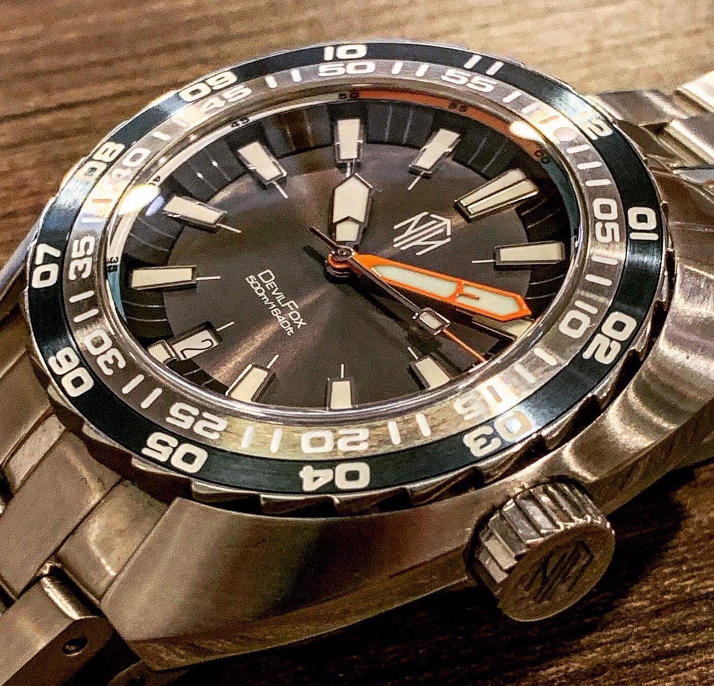 De 120 kliks bezel heeft een stalen 316L inlay welke een DLC behandeling heeft ondergaan om het wat minder slijtage gevoelig te maken. Het geheel zou sterker en meer krasvast dan aluminium moeten zijn en minder snel moeten kunnen breken dan een keramische inlay. Al met al een aparte keuze en dat kan ik wel waarderen. Alle markeringen op de bezel zijn uitgefreesd en gevuld met hetzelfde lichtgevende spul als de wijzers waardoor de bezel ook in het donker zijn functionaliteit behoud. Op 0 minuten is de driehoek in het rood uitgevoerd wat daardoor leuk contact zoekt met de rode modelnaam op de wijzerplaat. De bezel actie is voortreffelijk zonder speling en strak uitgelijnd.