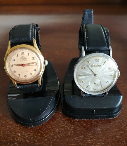 Links een Newmark, made in UK, ca. 1950, met een uurwerk gebaseerd op het Zwitserse Baumgartner 34 caliber.