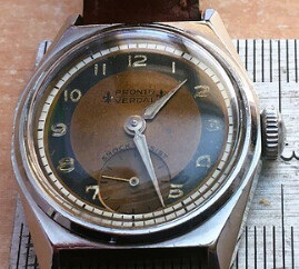 Het Newmark schoenpoets doosje, zo genoemd vanwege de tweedelige kast, waar het uurwerkje los in de bodem lag. Het bovendeel werd er bovenop geklikt, zodat het werkje klem vast zat in het kastje. Waterdicht? Neuhhh, stofdicht, nou nee ook niet. Een wonder dat het ding het na 70 jaar nog doet.