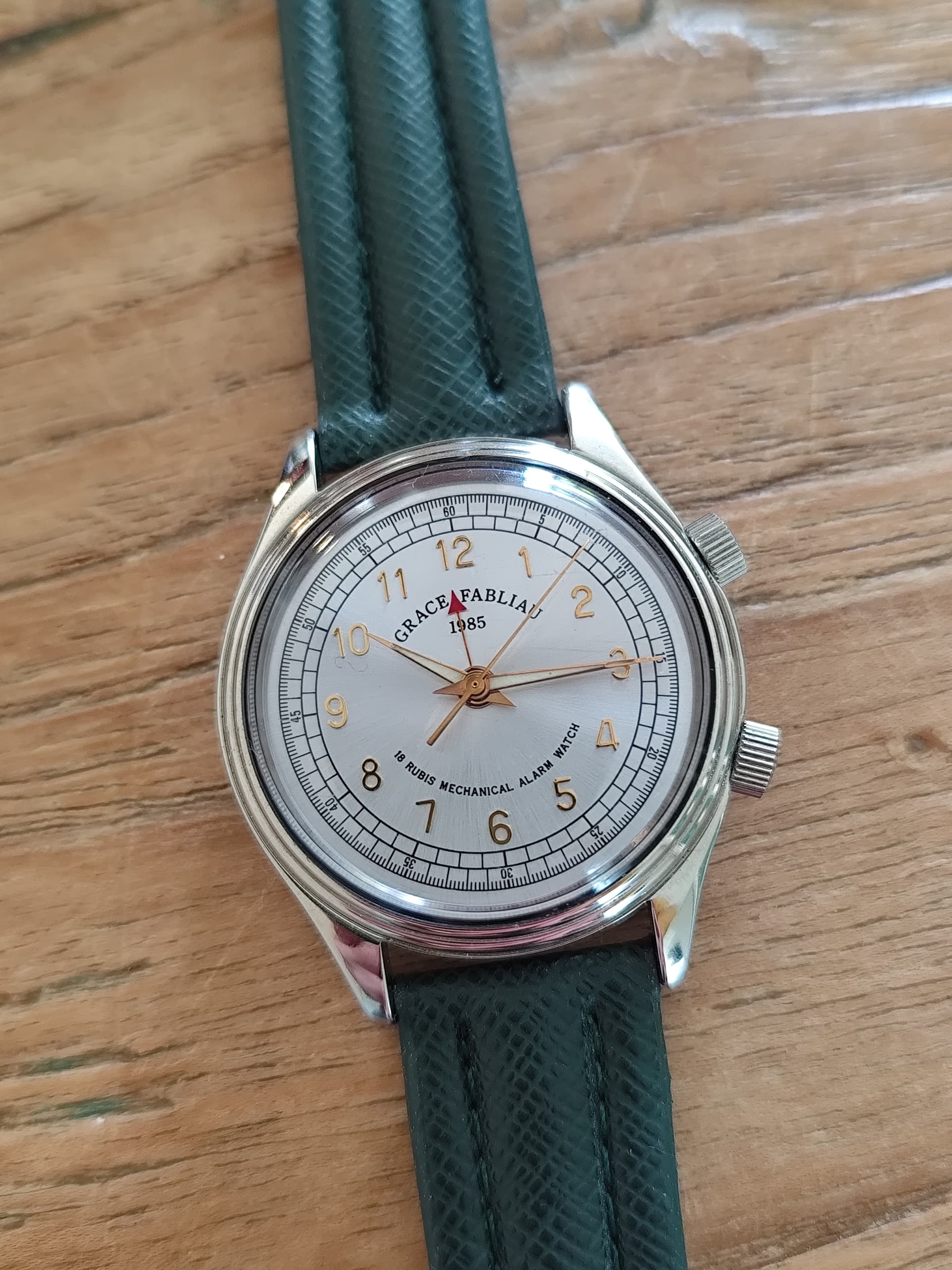 In die partij bij Marnix zat ook nog een enigszins vreemde eend in de bijt. Tussen alle rechthoekige en vierkante tankmodelletjes lag namelijk ook één rose gold 33 mm rond horloge. Een voor mijn redelijk smalle 17 cm pols zeer draagbaar maatje… Die heb ik ook gekocht en die loopt als een trein. Er zit een nogal iconisch uurwerkje in, namelijk een ETA 1080.