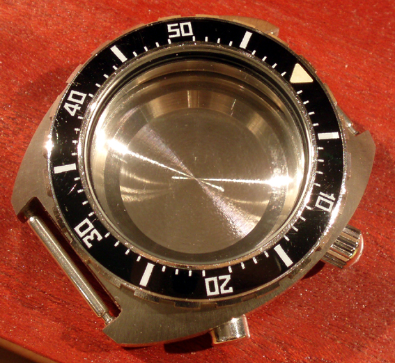 Dan een kast voor een Aquastar Benthos 500. Deze horloges waren rond de tijd dat ze uitkwamen het summum (maar dat zeggen ze allemaal) van duikhorloges. Waterdicht tot 500 meter (ze waren er ook tot 1000 meter) maar deze Aquastar Benthos 500 horloges hadden nog een gimmick. Er zat een soort flyback minutenteller in. Bij het drukken op de kroon ging een extra minutenwijzer naar de 0 en zo kon men de duiktijd makkelijk en veilig bijhouden. Eigenlijk had het dus geen duikring nodig. Maar die zit er gelukkig wel op, ik vind de kast (42 mm kastdiameter) prachtig. Probleem is dat er een AS kaliber 2162 uurwerk in hoort dat door Aquastar van een opbouw werd voorzien voor de flyback minutenwijzer. Die kom je dus niet tegen. Aquastar bestaat nog (hoewel ik eerder denk dat ze weer bestaan), ik zal ze eens mailen. Wie weet.