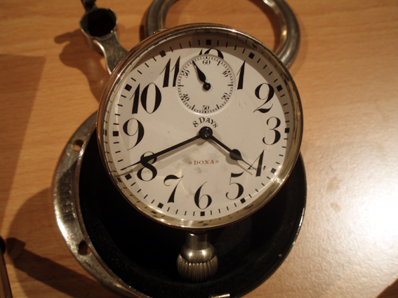 Dan een aanwinst die eigenlijk niet bij de Rikketik hoort omdat ik die via Marktplaats heb gekocht. Maar de verkoper kwam 'm afgeven bij de Rikketik omdat hij om de hoek woont. Het is een Doxa autohorloge met 8 daags uurwerk met de originele montage voor in de auto uit begin vorige eeuw. Antiek dus! Doxa is bekend geworden met dit soort autohorloges o.a. voor Bugatti. Zie http://www.horloge.info/merk_info.php?n=Doxa&merkid=114