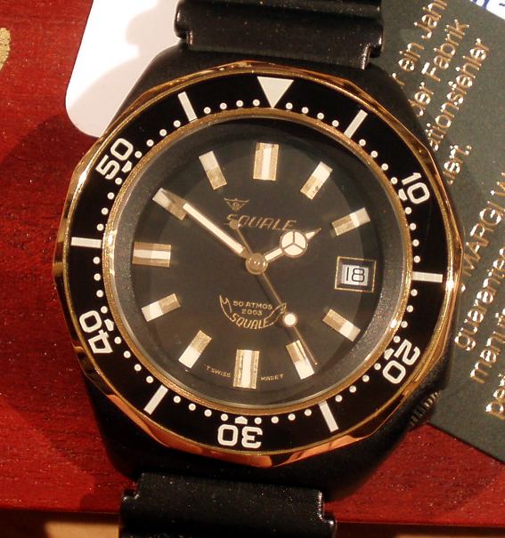 Uit een eerdere post over Squale: De geschiedenis van Squale, een Italiaans bedrijf, is niet helemaal duidelijk. Ze zijn in de jaren 90 van de vorige eeuw of zelfs pas begin eenentwintigste eeuw failliet gegaan. Squale (haai in het Italiaans en Frans) was een bedrijf dat kasten voor horloges bouwde en onder de naam van andere bedrijven (maar soms ook voor zichzelf) op de markt bracht. Je komt ze dus tegen onder de noemer Squale maar veel vaker met een andere merknaam. Maar wel altijd met het Squale logo op de plaat.