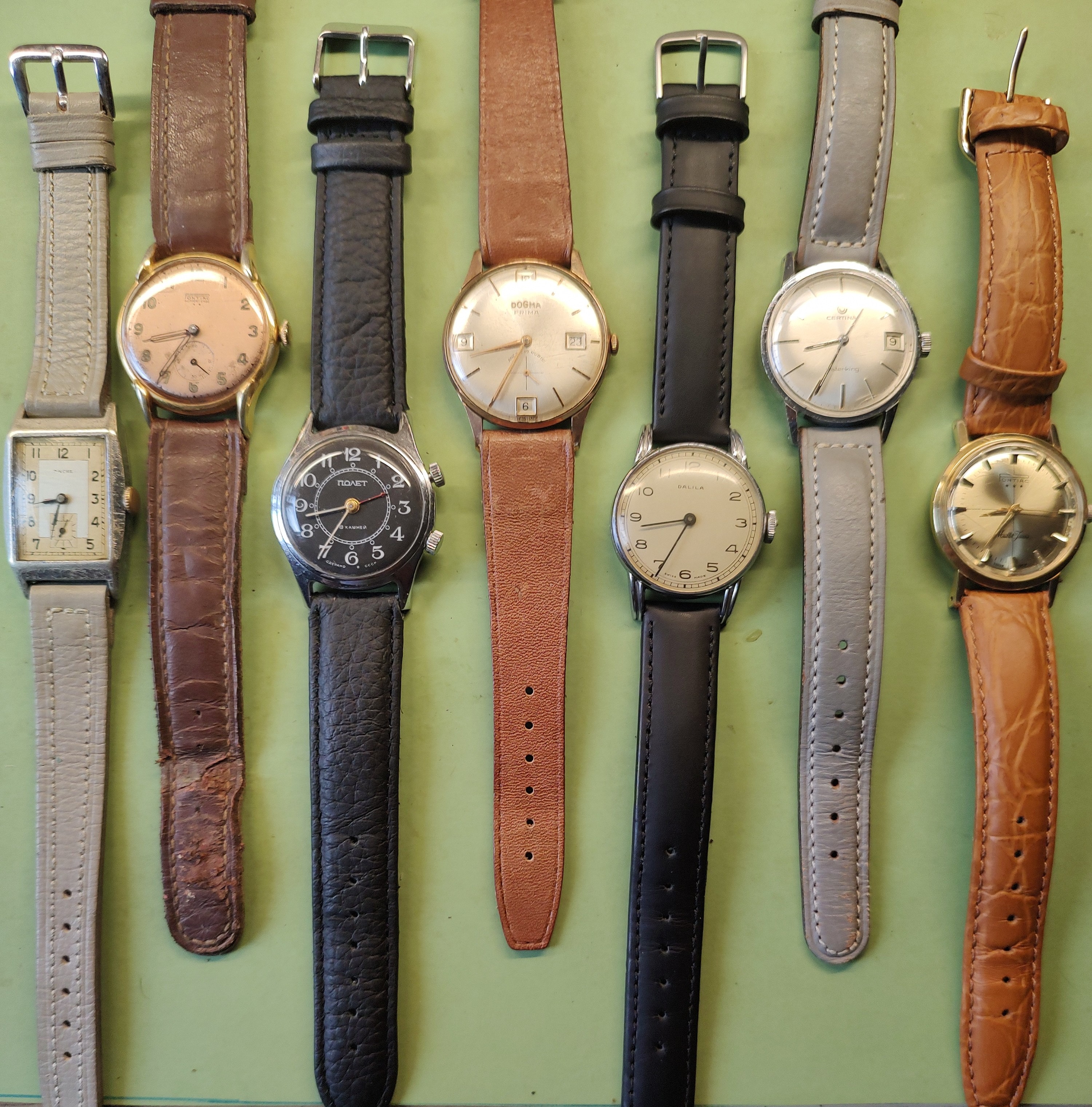 18, 20 en 22mm bandjes waaronder een groene en oranje tropic style, bandleden, skindiver, NOS Mickey Mouse horloges voor mijn geestelijk gehandicapte zusje, porte montre en Horotec schroevendraaiers.
