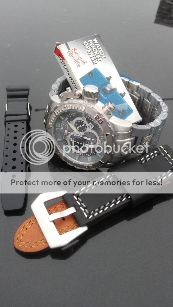 Mijn score van vandaag: een rubber bandje (18mm) gekregen van Henrik, een leren band met grote buckle voor de Helson Sharkdiver en een tooltje om kasten mee los te draaien.