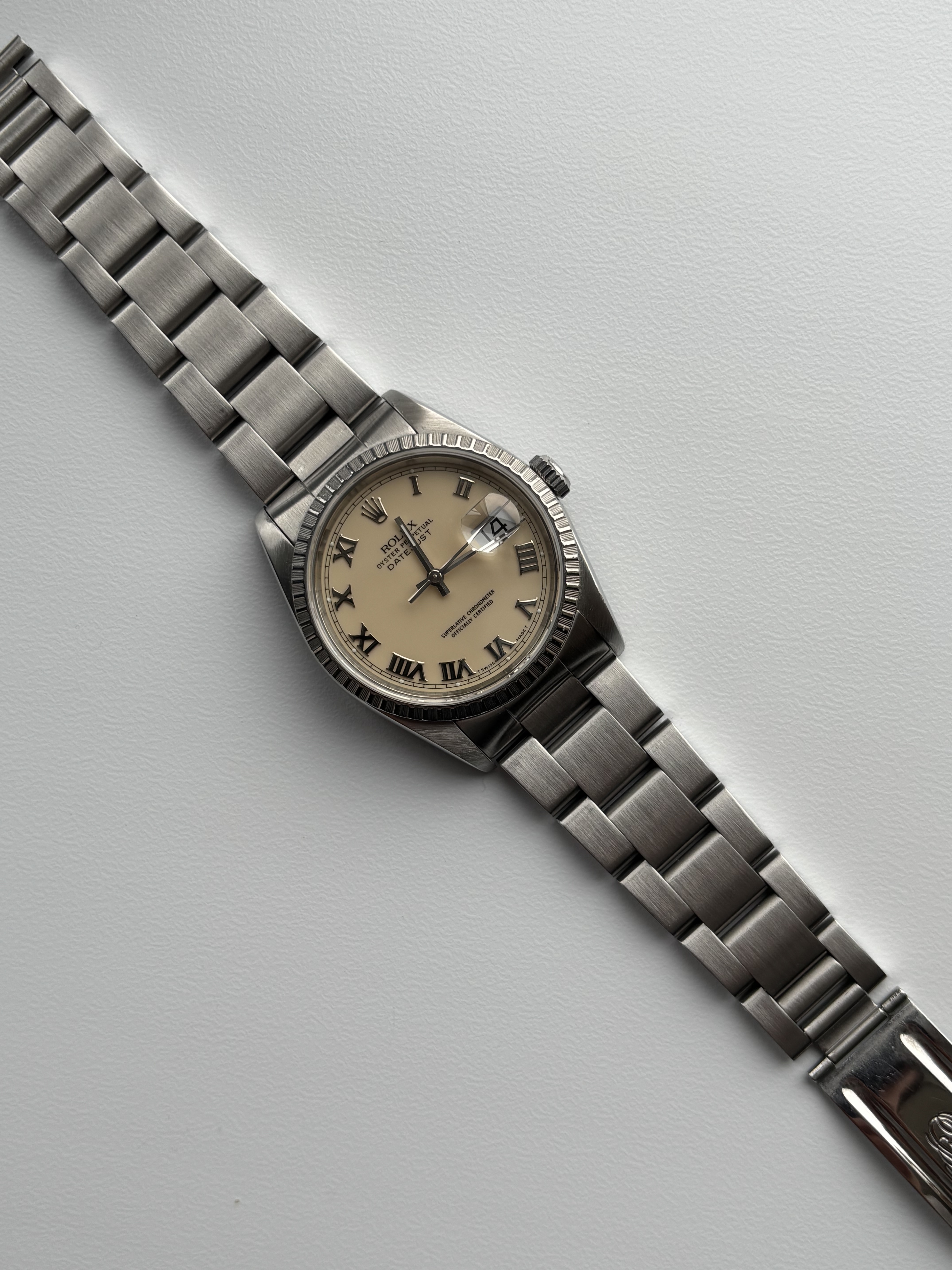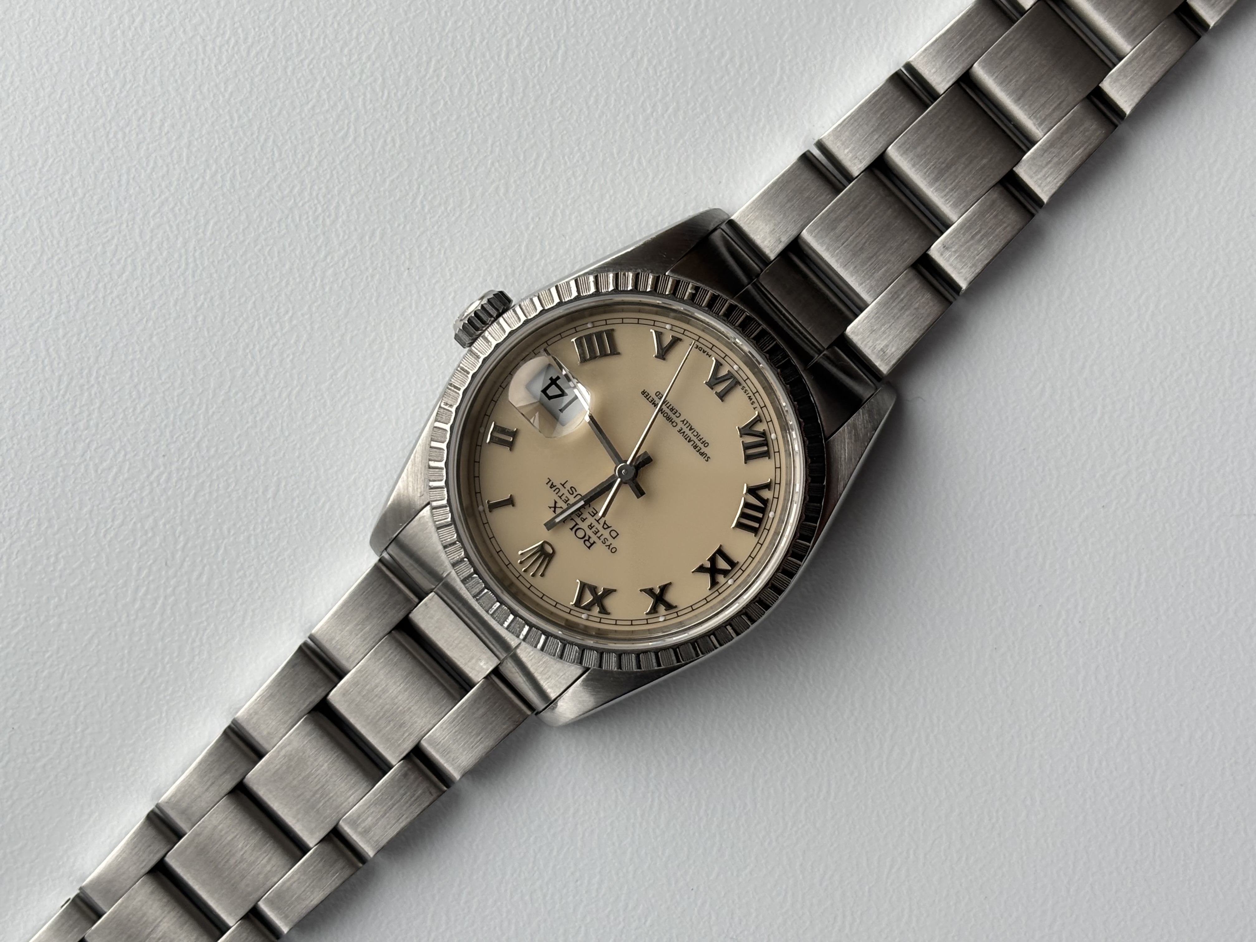 Aangeboden mijn nette Rolex 16220 met Ivory Dail uit 1990 (E-serial) in nette staat! Band vertoont vrijwel geen rek, kast heeft scherpe volle lugs en de wijzerplaat is smet loos.
