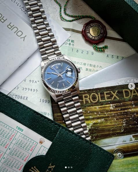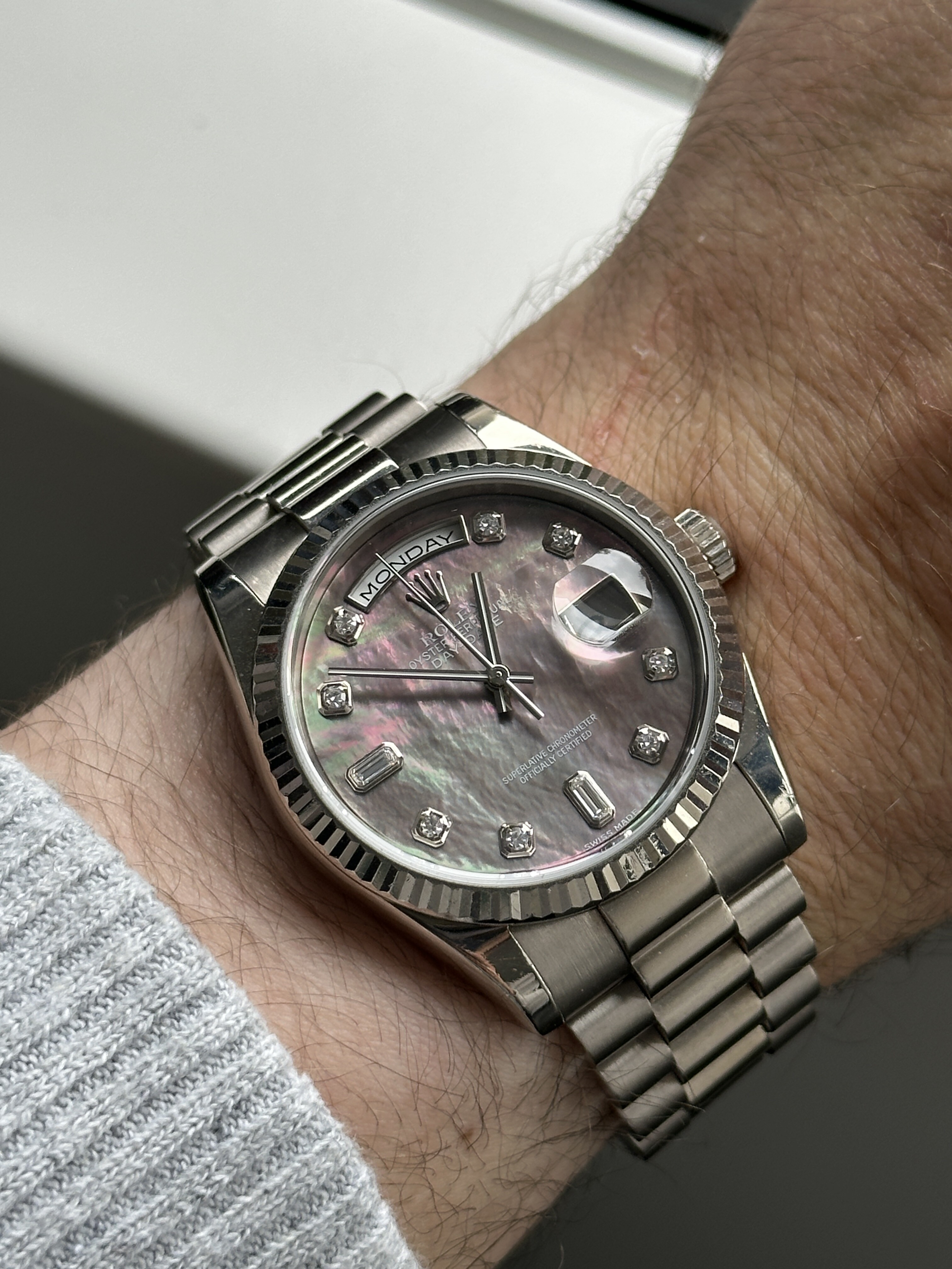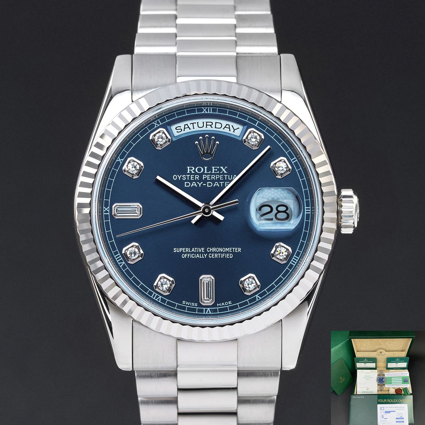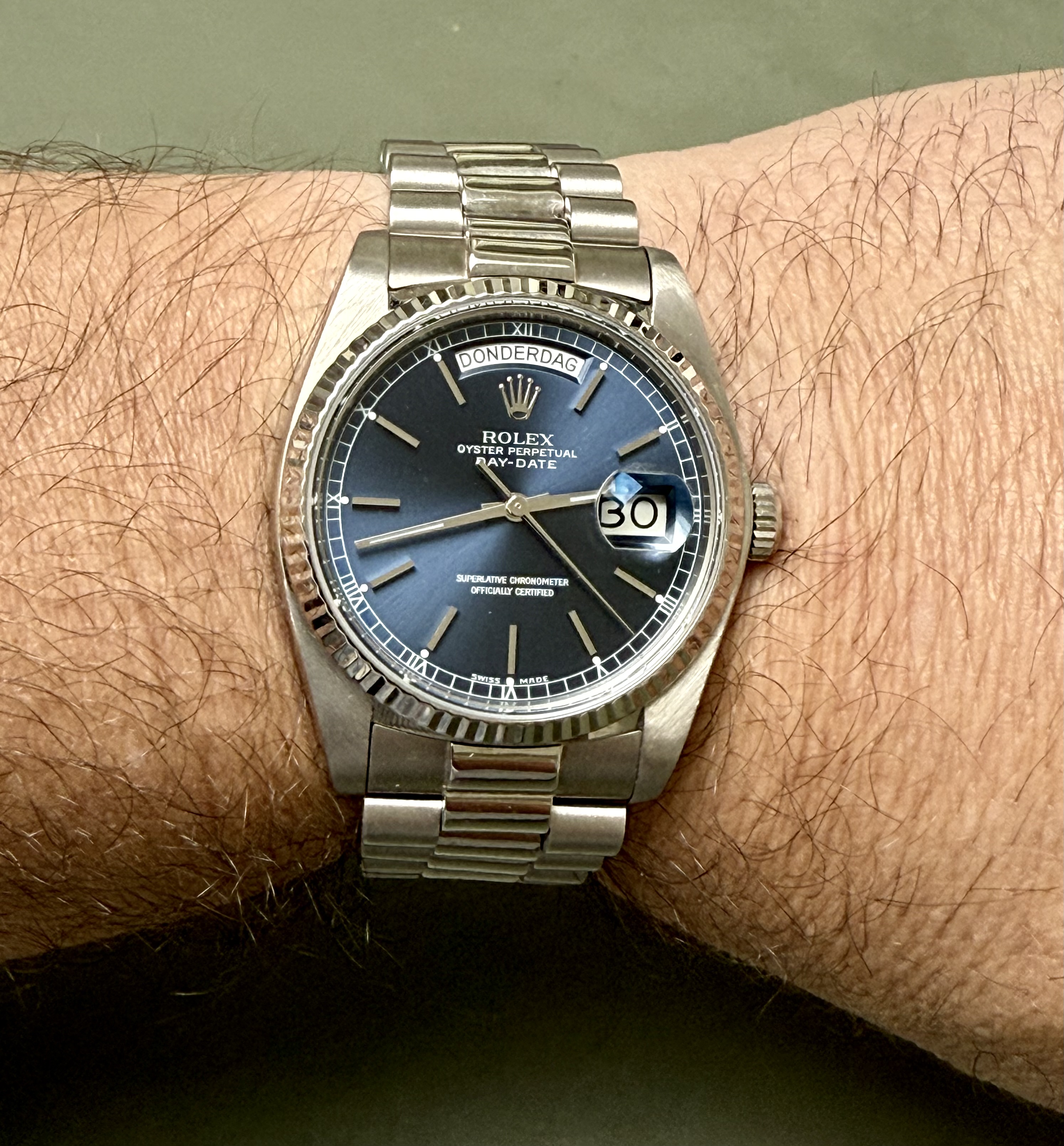 Gezocht: een super strakke Rolex Daydate 18239 (eventueel een 118239), met blauwe dial en liefst full set. Hou me aanbevolen voor tips (het aanbod op chrono24 is me bekend).