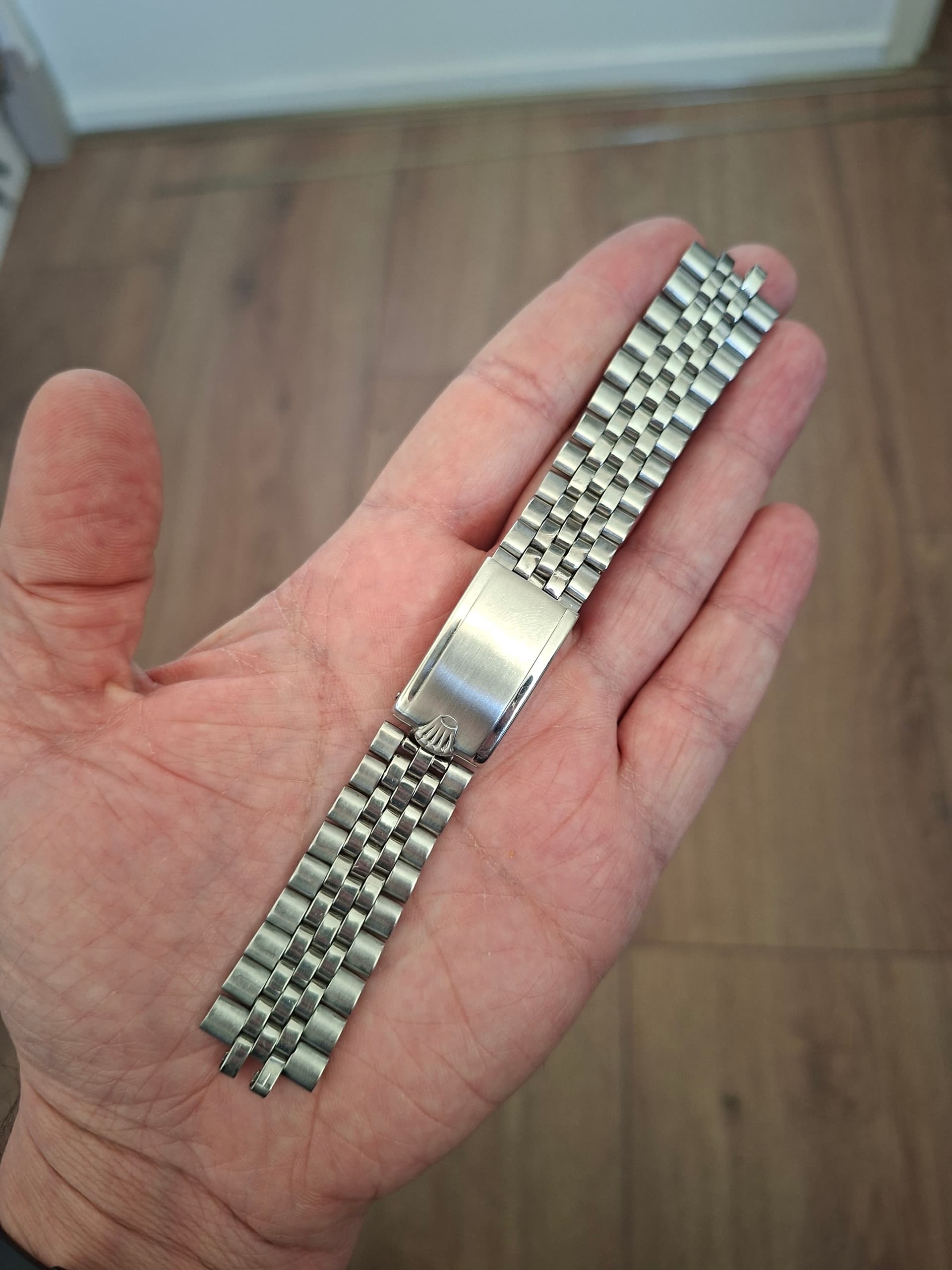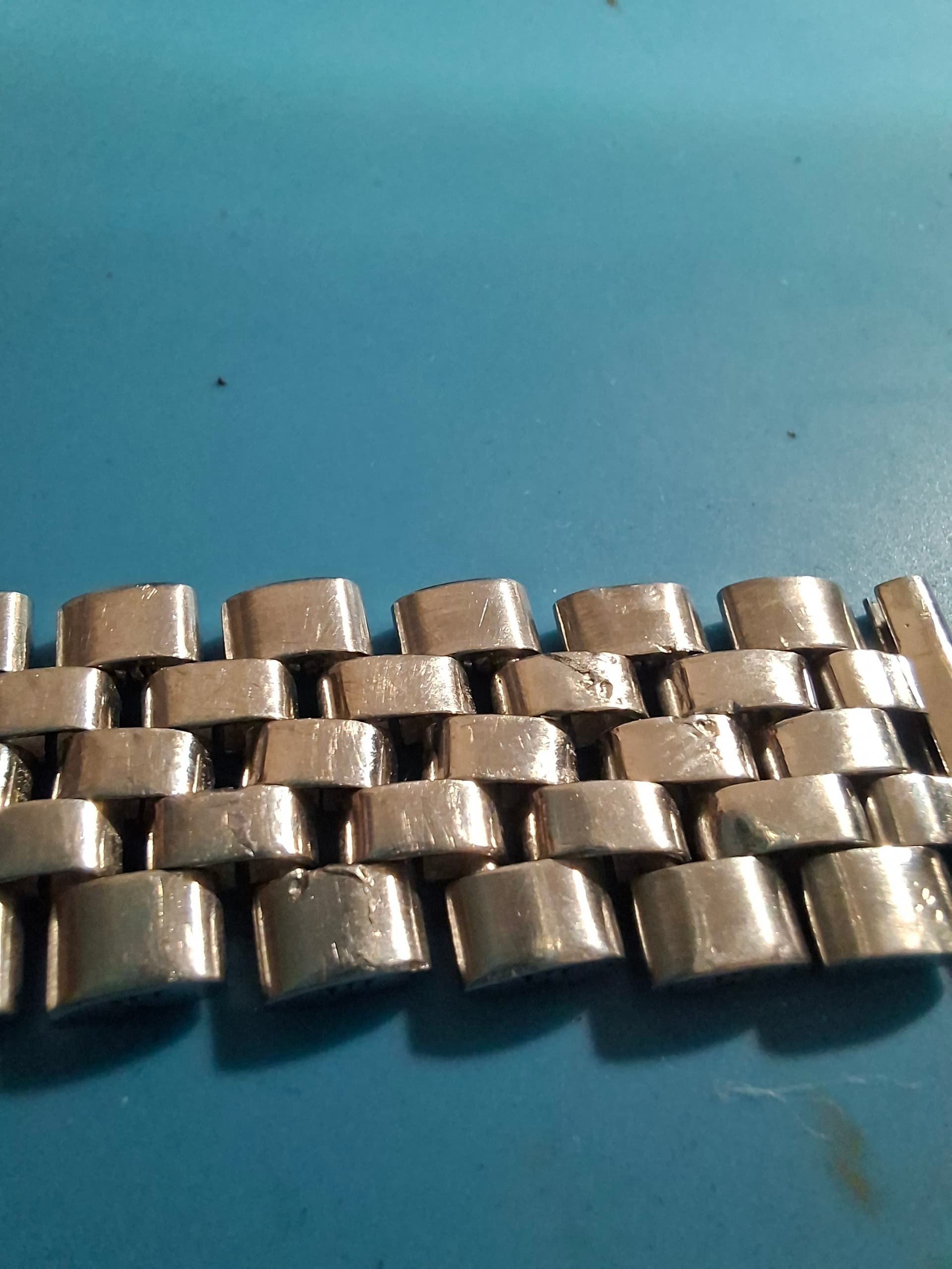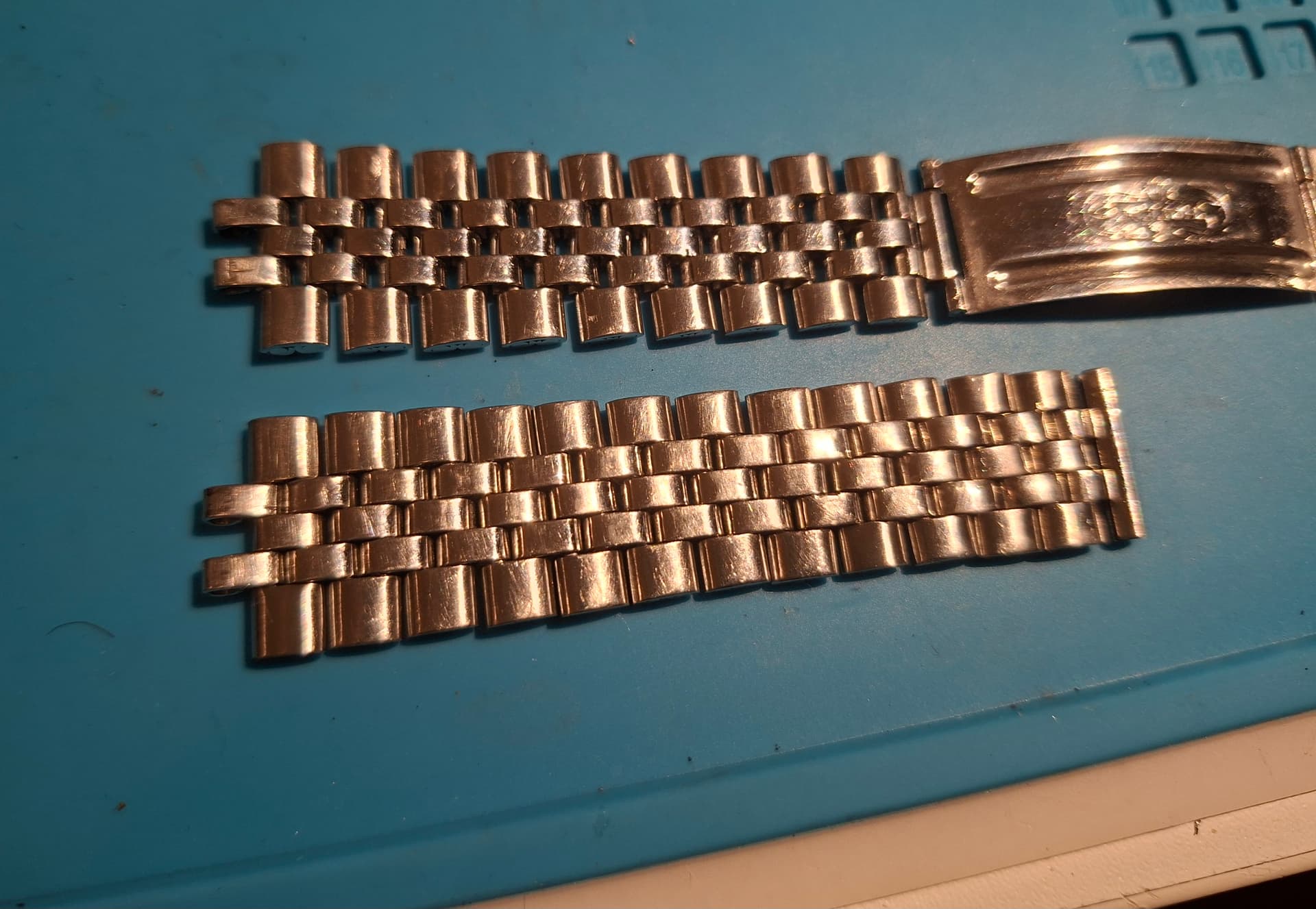 Hoi mensen! Rolex Folded Jubilee bandje met rek en wat forse butsen in een paar schakels te restaureren. Alleen de butsen eruit halen en de sluiting opnieuw brushen. Uiteraard rek er zoveel mogelijk uit, zodat deze weer mooi om de pols valt. Owja de band Connector was helemaal versleten inclusief de pin.