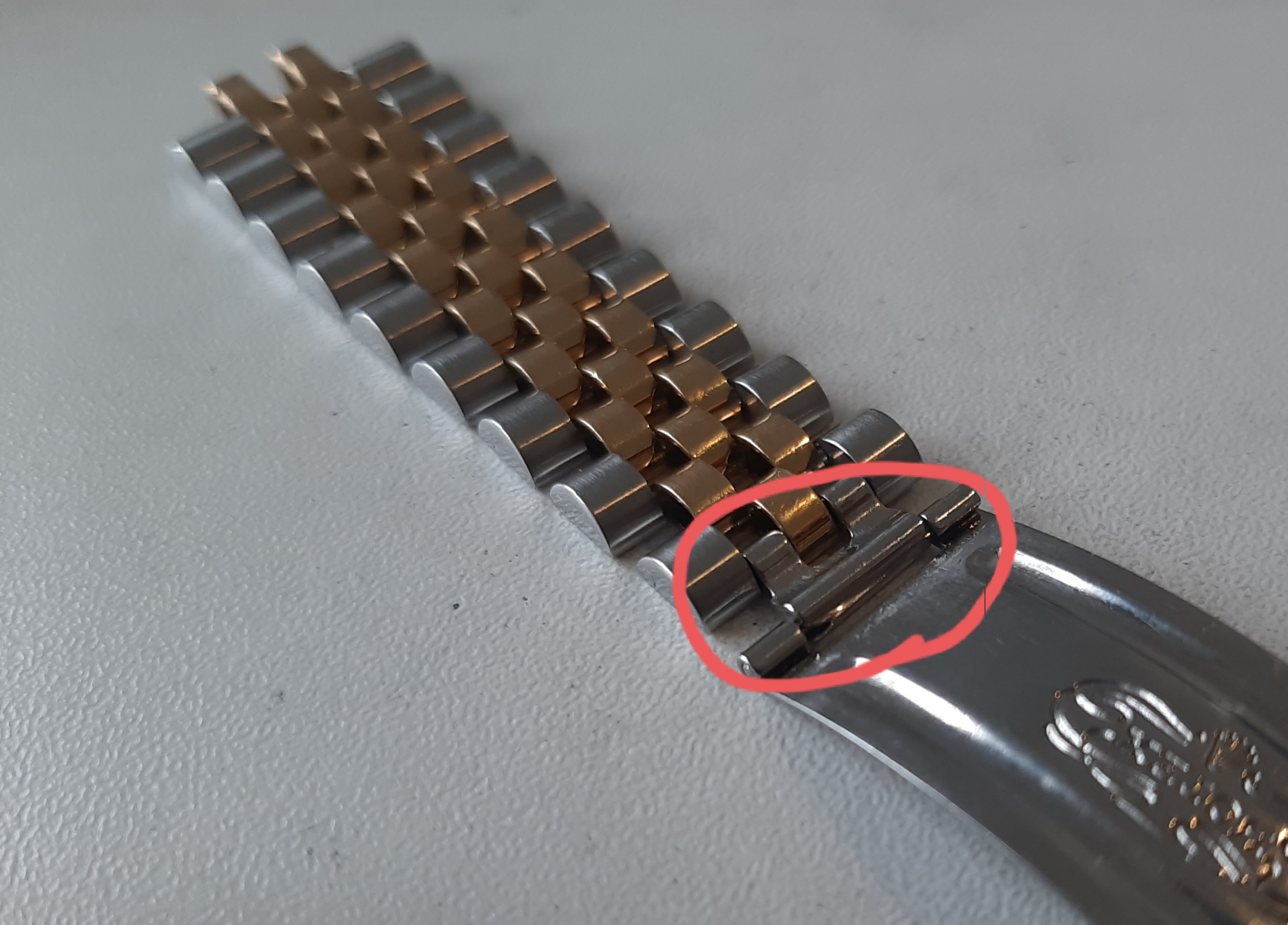 Meestal slijten de pinnen inderdaad het meest in, maar dit verschilt uiteraard per jubilee of oyster band, want elke band slijt anders in en daarom is het restaureren maatwerk. Vreemd genoeg slijten de pinnen van two-tone (goud-staal) banden meestal meer in dan de middenschakkels. Goud is inderdaad zachter dan RVS. Ik vermoed dat het door de vormgeving van de pinnen en schakels en het type frictie komt dat de pinnen sneller inslijten. Tevens heb ik bepaalde technieken ontwikkelt, waardoor de pin niet meer op exact hetzelfde punt in de middenschakel inslijt.