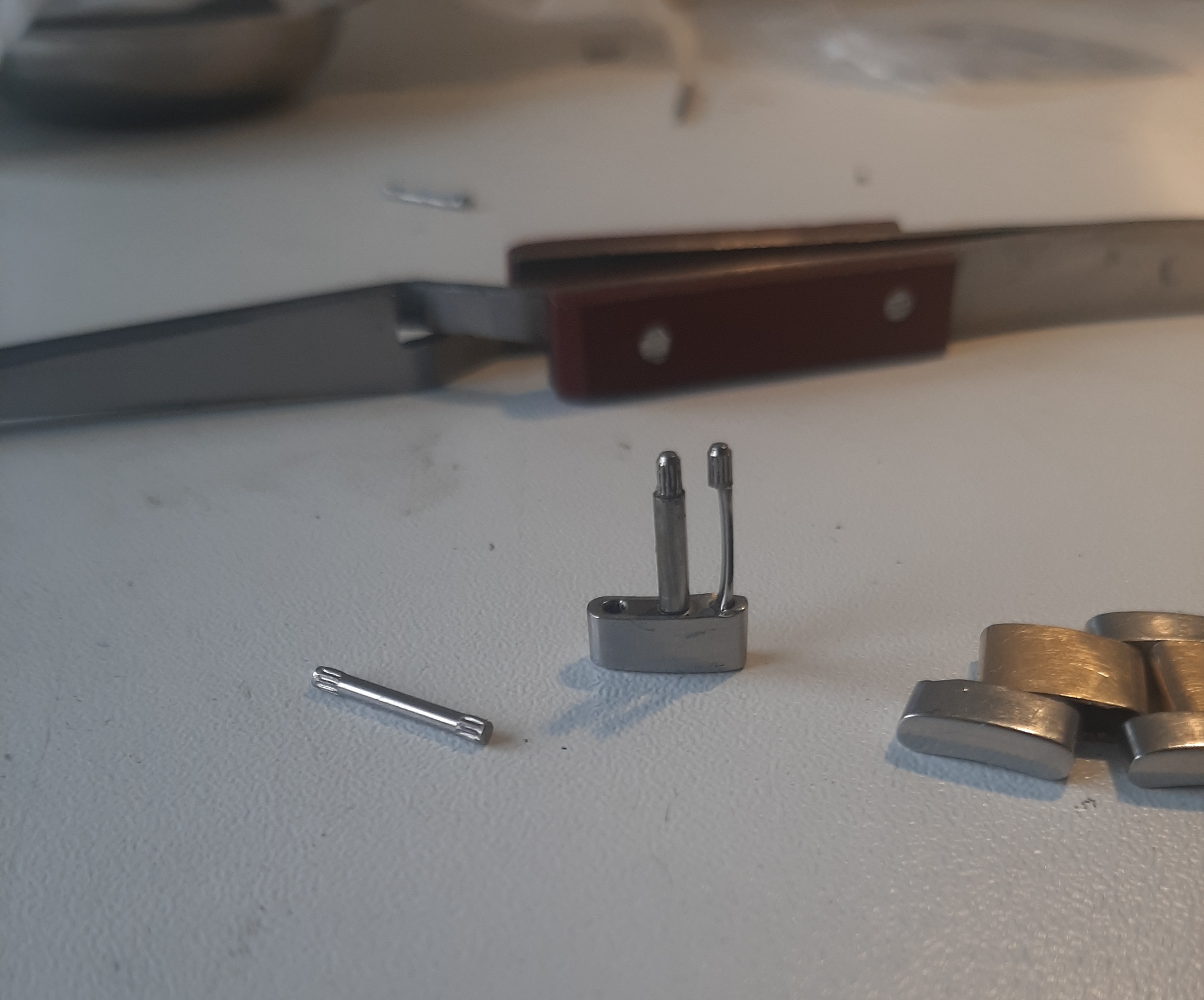 nieuw tussen-stukje gemonteerd op de band. Daarna nog even de nieuwe pin in de sluiting geperst en this job is done🙏
