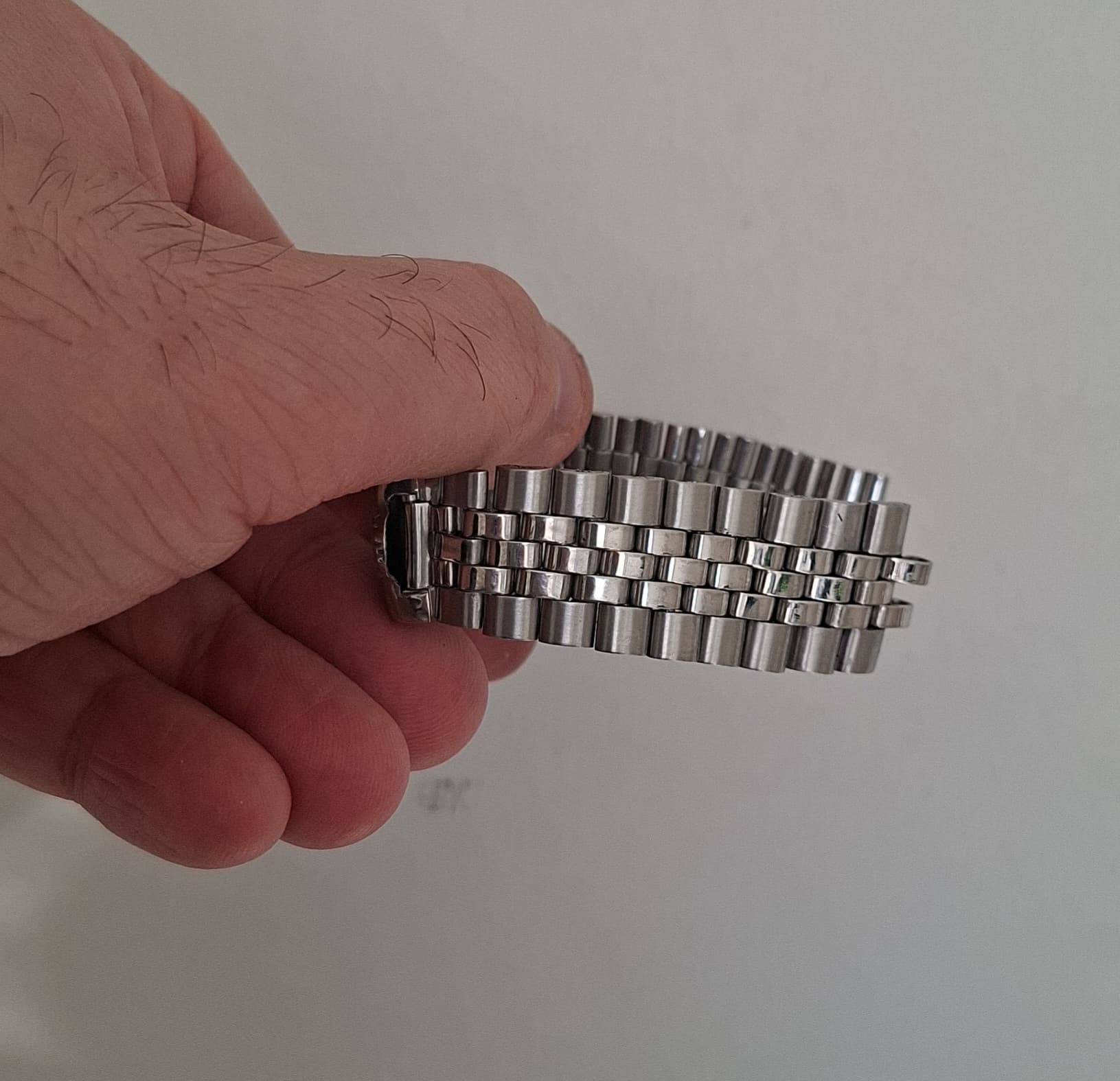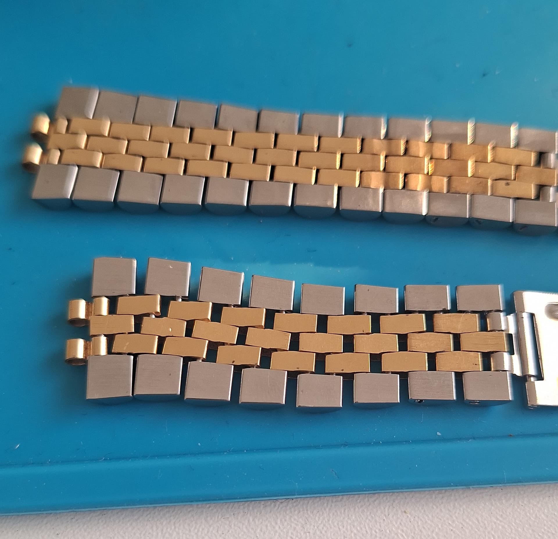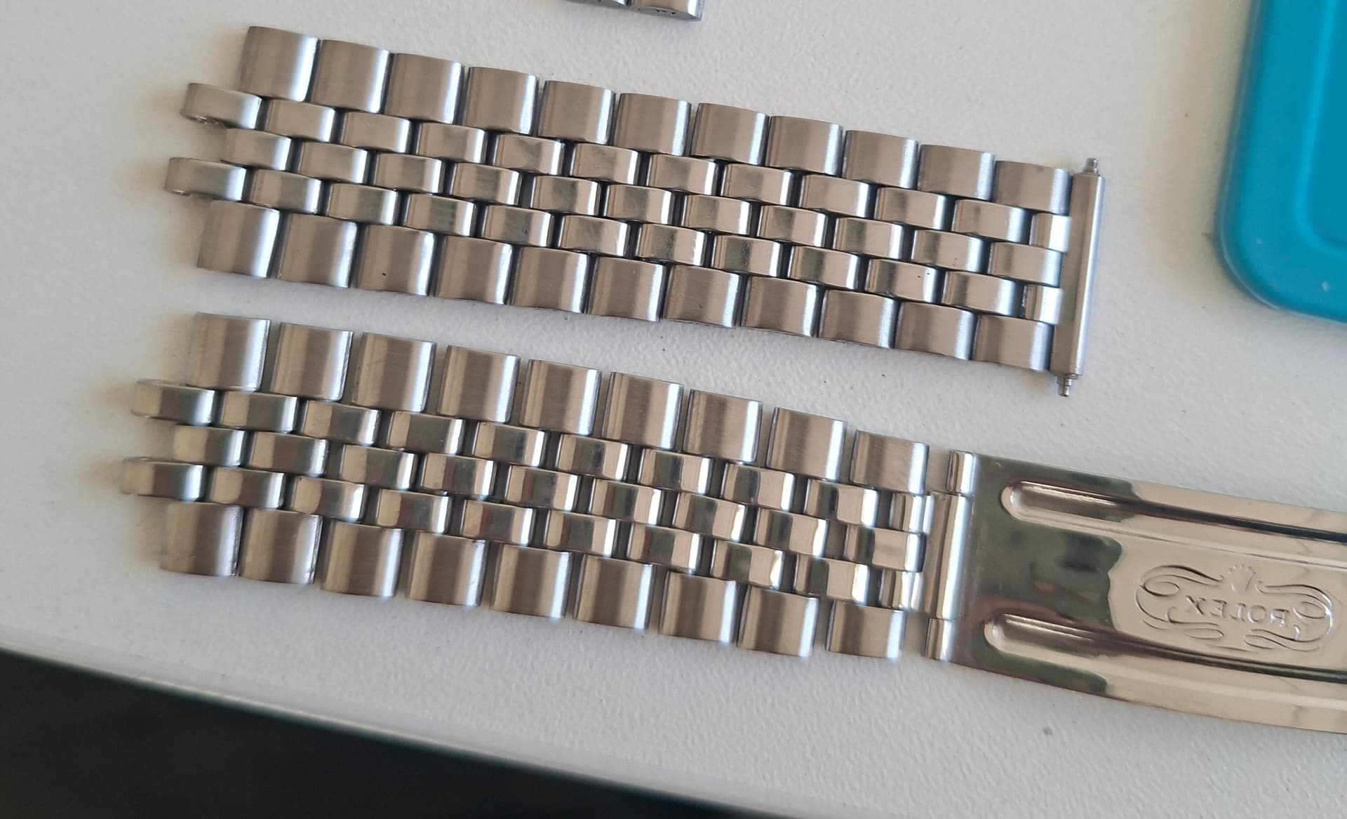 Hoi mensen! Rolex Folded Jubilee bandje met rek en wat forse butsen in een paar schakels te restaureren. Alleen de butsen eruit halen en de sluiting opnieuw brushen. Uiteraard rek er zoveel mogelijk uit, zodat deze weer mooi om de pols valt. Owja de band Connector was helemaal versleten inclusief de pin.