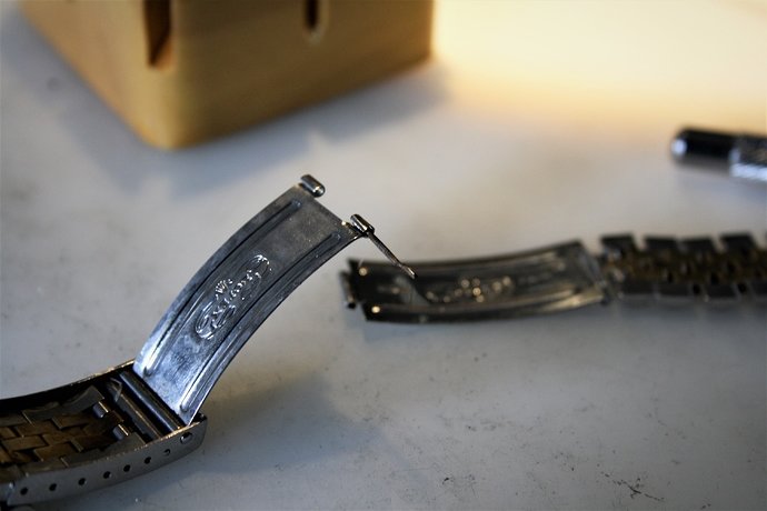 In hele zeldzame gevallen krijg ik jubilee banden met extreem versleten pinnen, dat deze bij het verwijderen al breken. Hoe groter de rek, hoe groter de kans op de onderstaande situatie. Ellendig, want in die specifieke schakel moet toch echt een nieuwe pin. Ik heb wel eens de vraag gekregen of ik deze schakels vervang, maar ik houd het het liefst origineel dus wordt het uitboren. In enkele gevallen is het niet meer uit te boren en moet er een nieuwe schakel in de plaats komen.