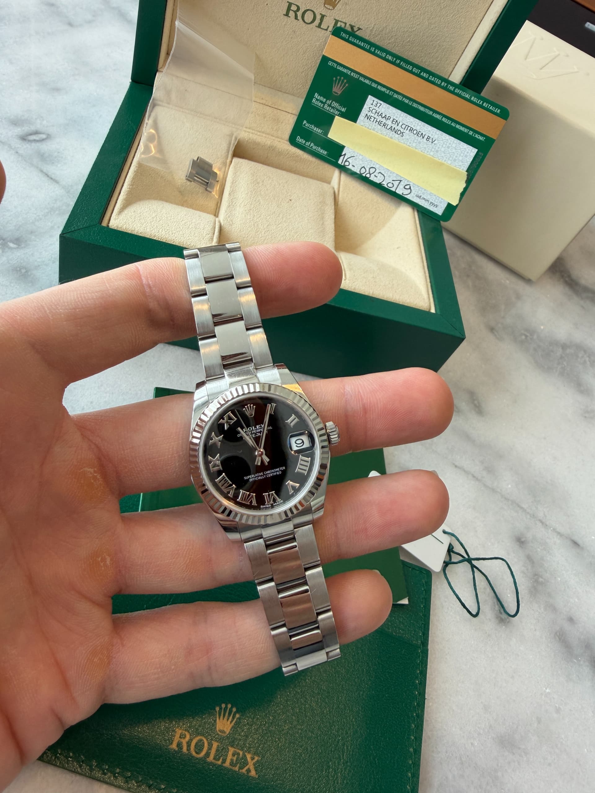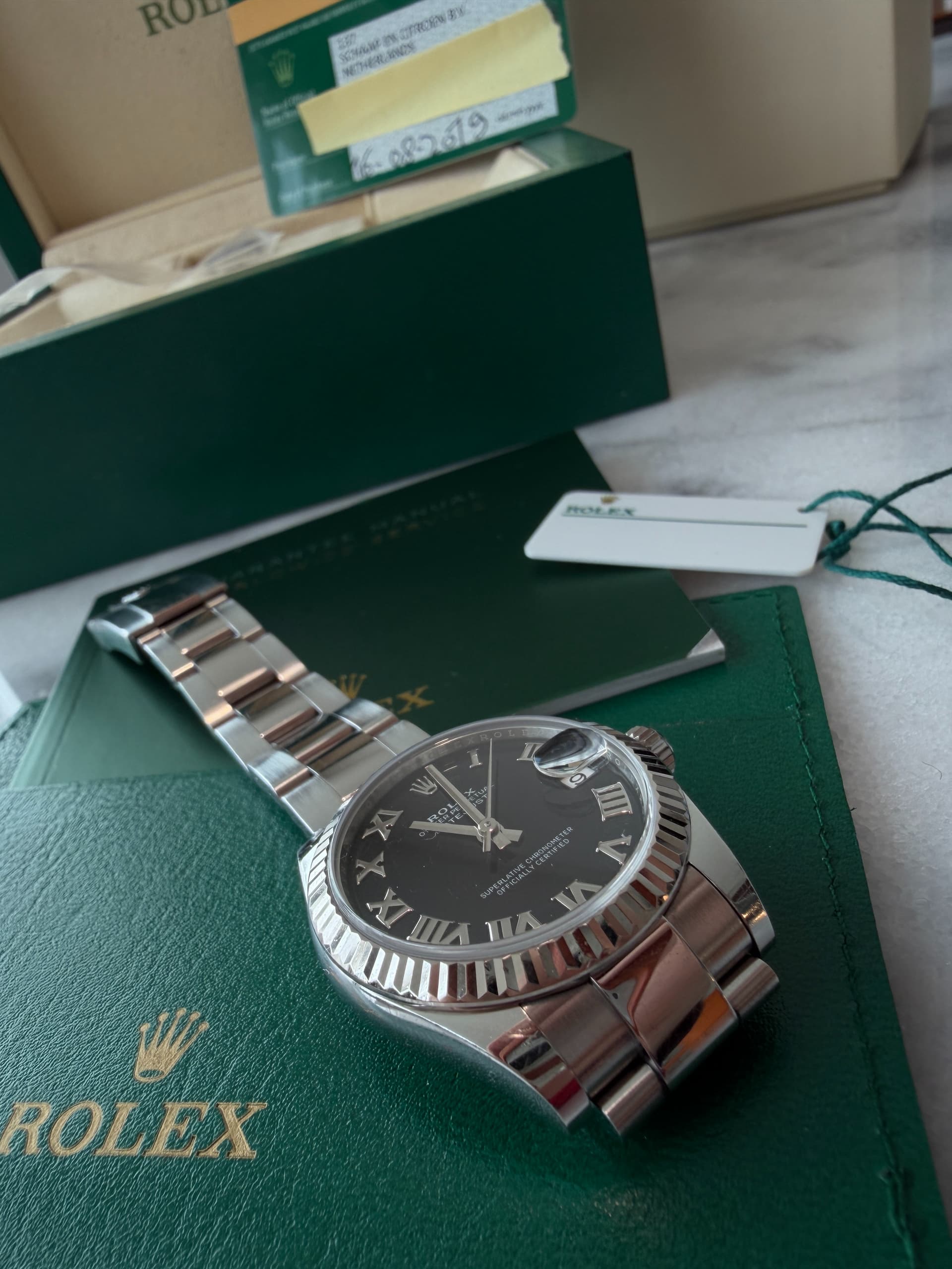 Deze schitterende Rolex Datejust 31mm met zwarte roman wijzerplaat mag plaatsmaken voor wat anders. Sinds 2024 in bezit en aangeschaft bij een gerenommeerde handelaar. Horloge komt met complete set.