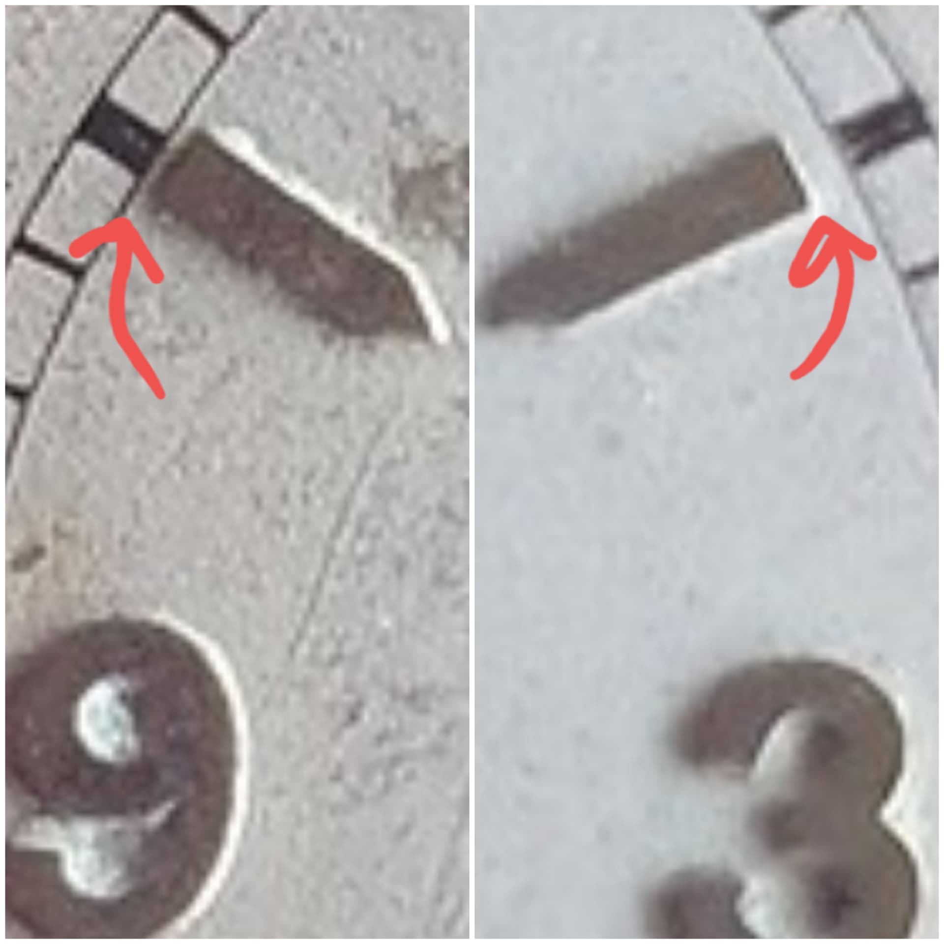 Kan natuurlijk door de foto komen (of zo horen) maar mij valt meteen op dat de 5 en de 7 indices niet gelijk uitkomen bij de seconden-dial. Vind sowieso die indices schots en scheef staan (noujah, meer de afstanden), maar misschien hoort het wel