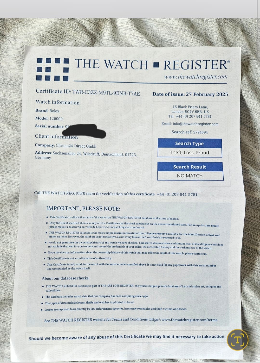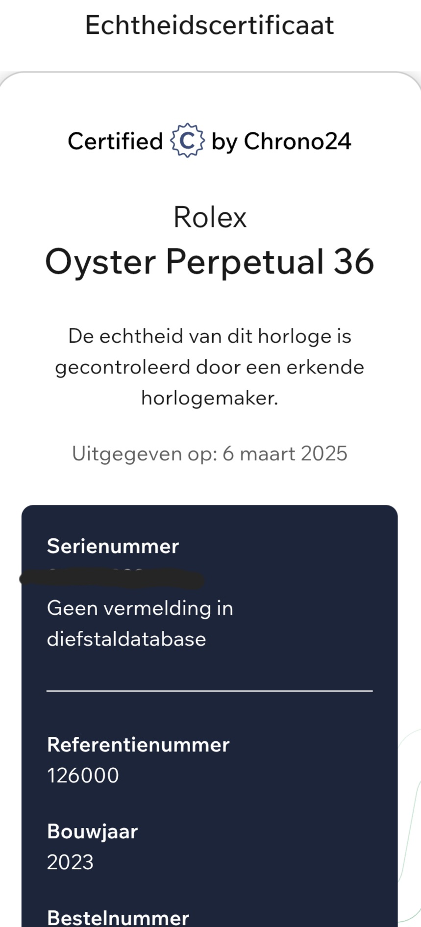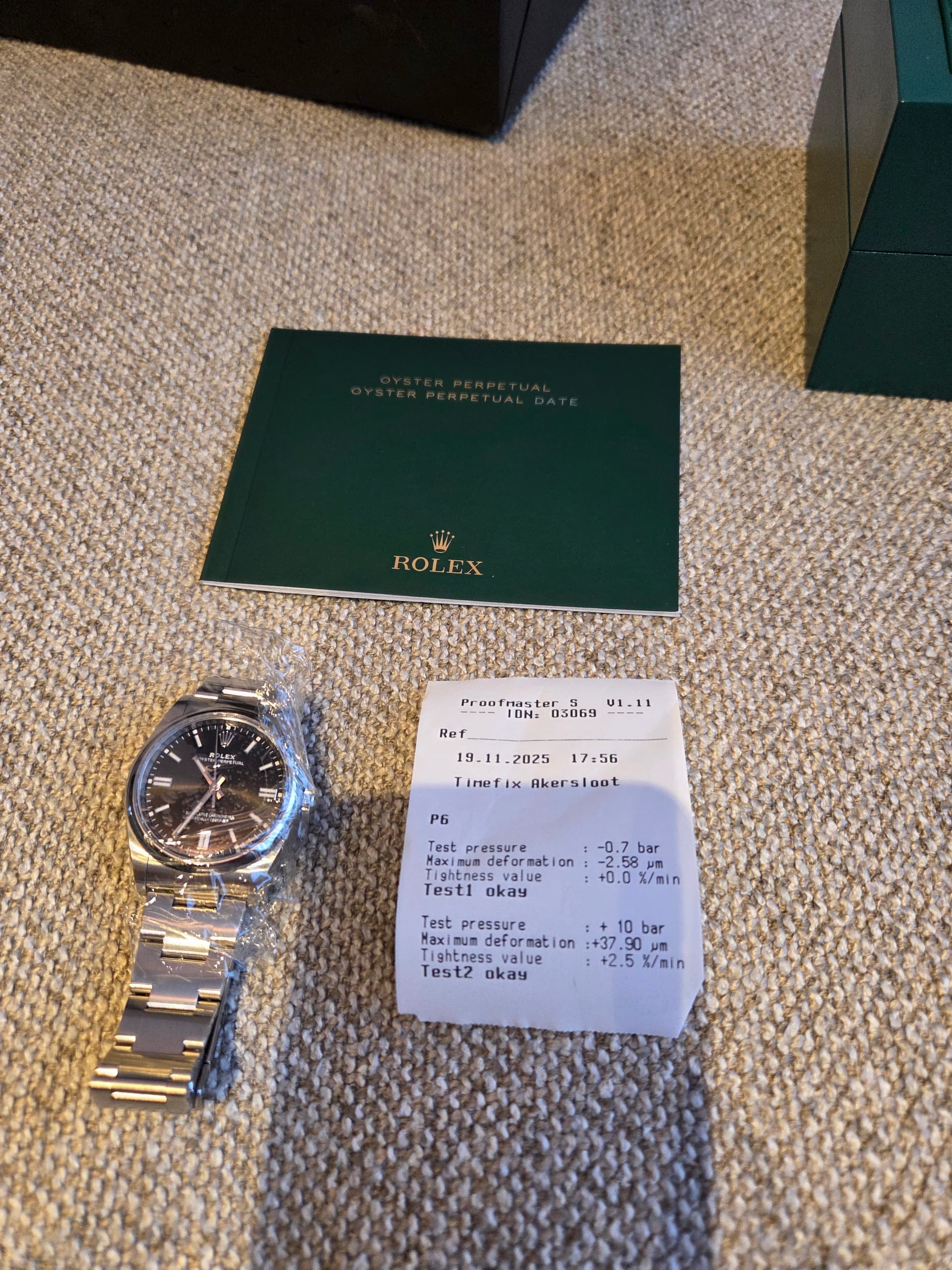 Daarentegen wel certificaat van echtheidscontrole en een uitdraai van de Rolex AD waaruit blijkt dat dit horloge is verkocht op 13 juli 2023 met dit serienummer en deze uitvoering.