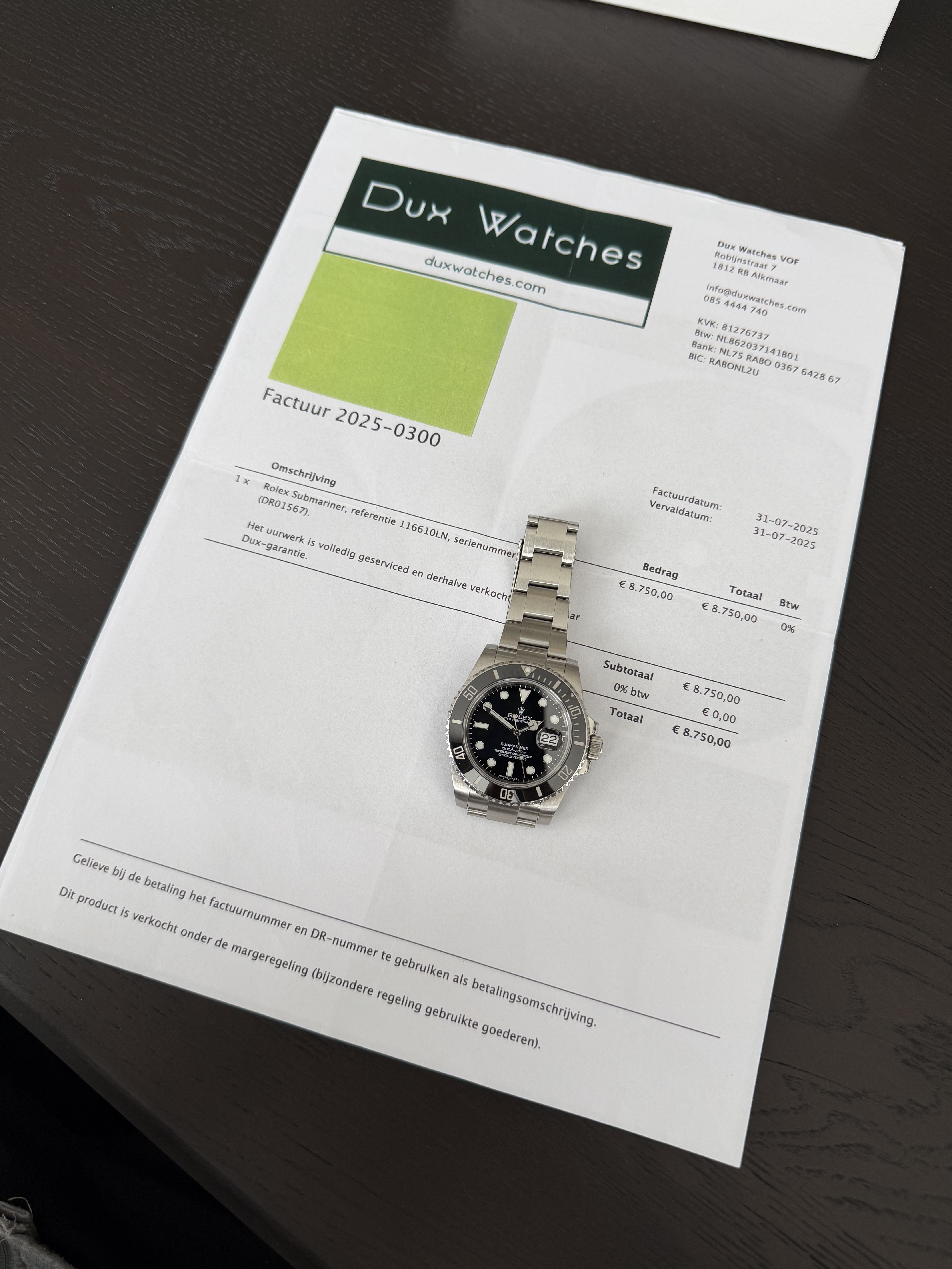Factuur en/of certificaat: factuur van Dux en bewijs van het Rolex register over de leeftijd van het horloge. Bewijs en relevante info overhandig ik tijdens de aankoop.