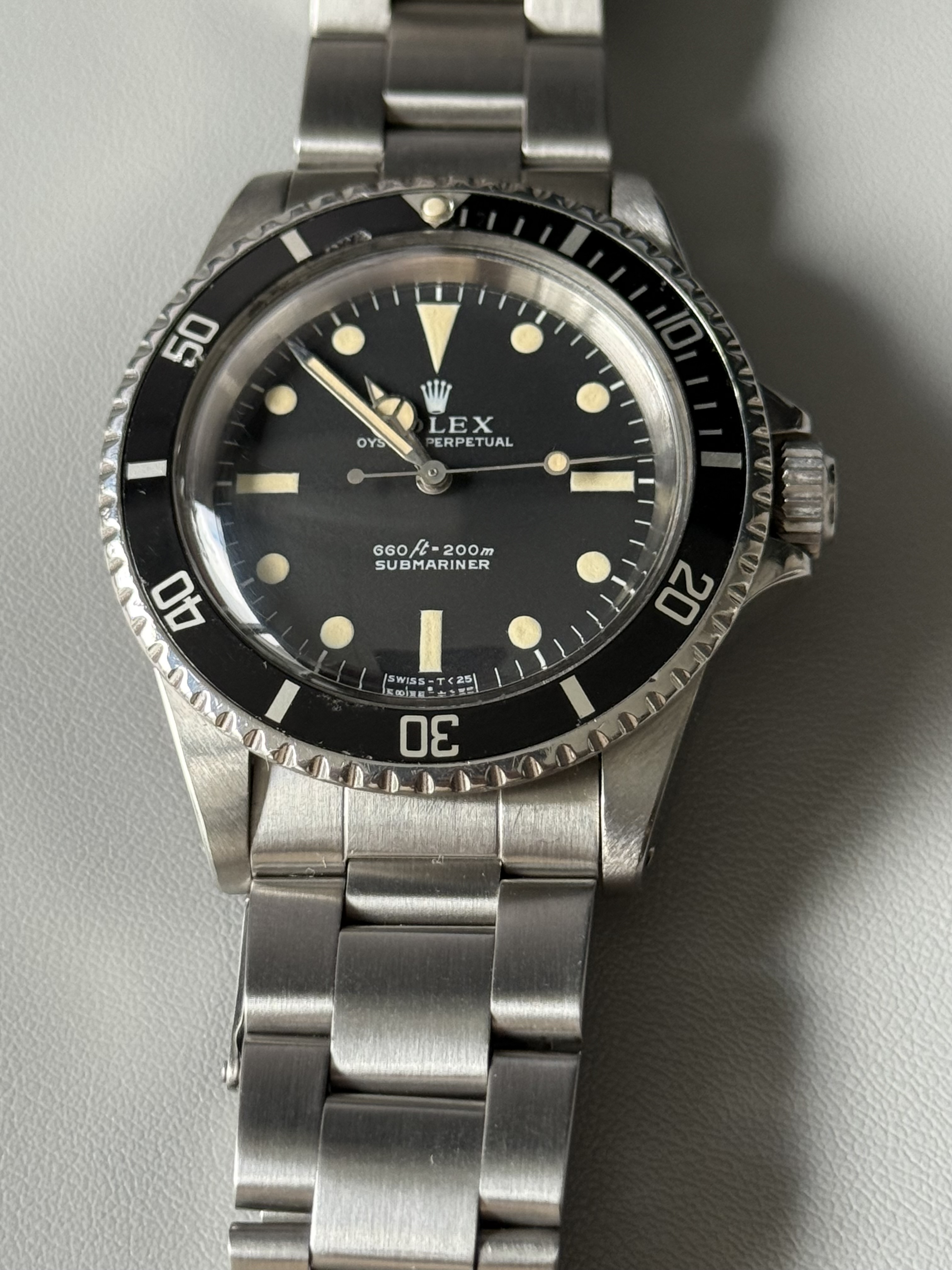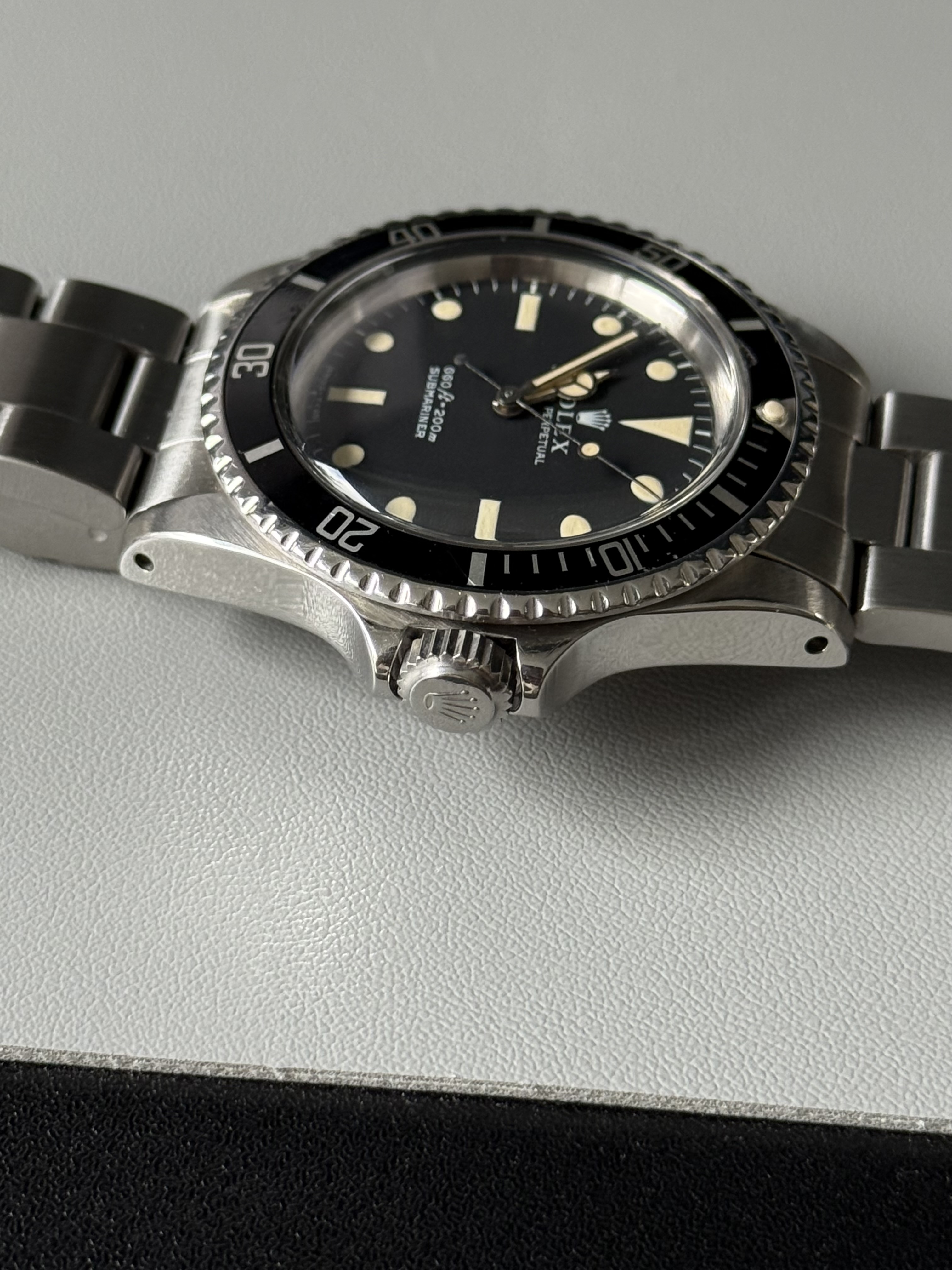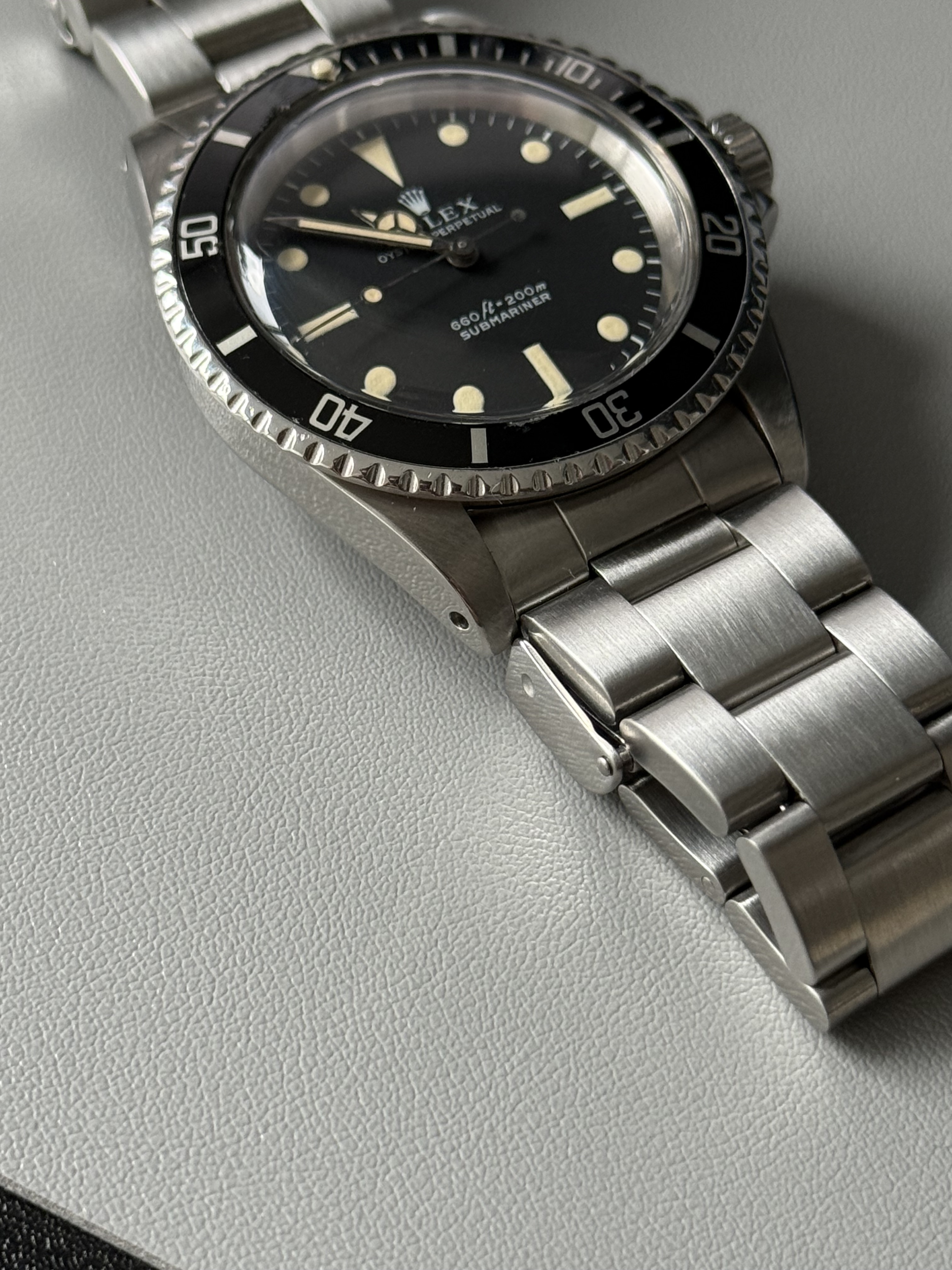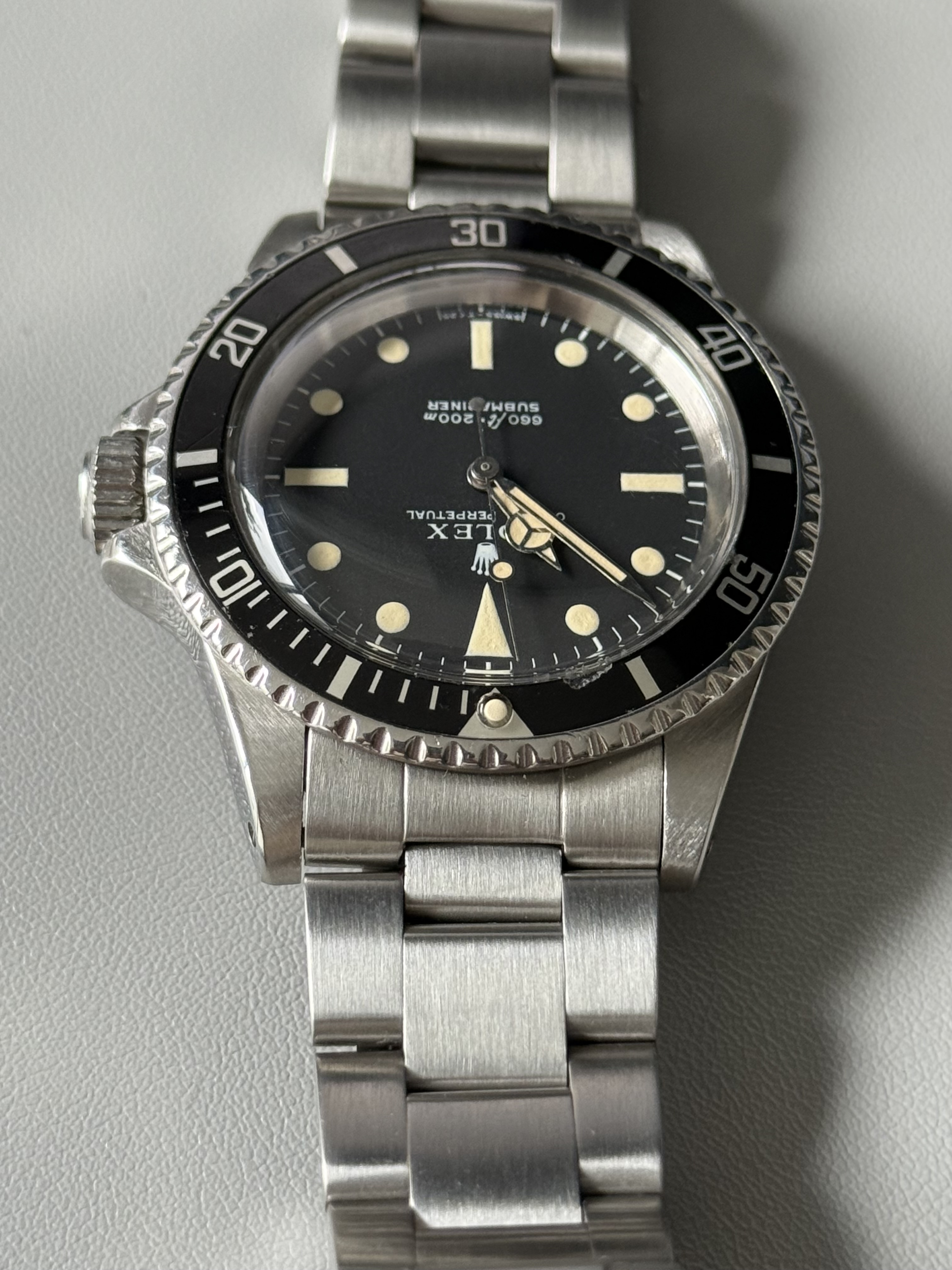 Het horloge heeft een prachtig originele patina op zowel de wijzers als de indexen. De wijzerplaat verkeert in uitstekende staat, zonder enige vlekjes of onregelmatigheden. De kast is mooi dik, zonder noemenswaardige deuken of krassen. De gemonteerde band is een latere, solide 93150, wat het horloge wat geschikter maakt voor dagelijks gebruik. De inlay is een zogeheten late 70’s – early 80’s midfont, met enkele gebruikssporen.