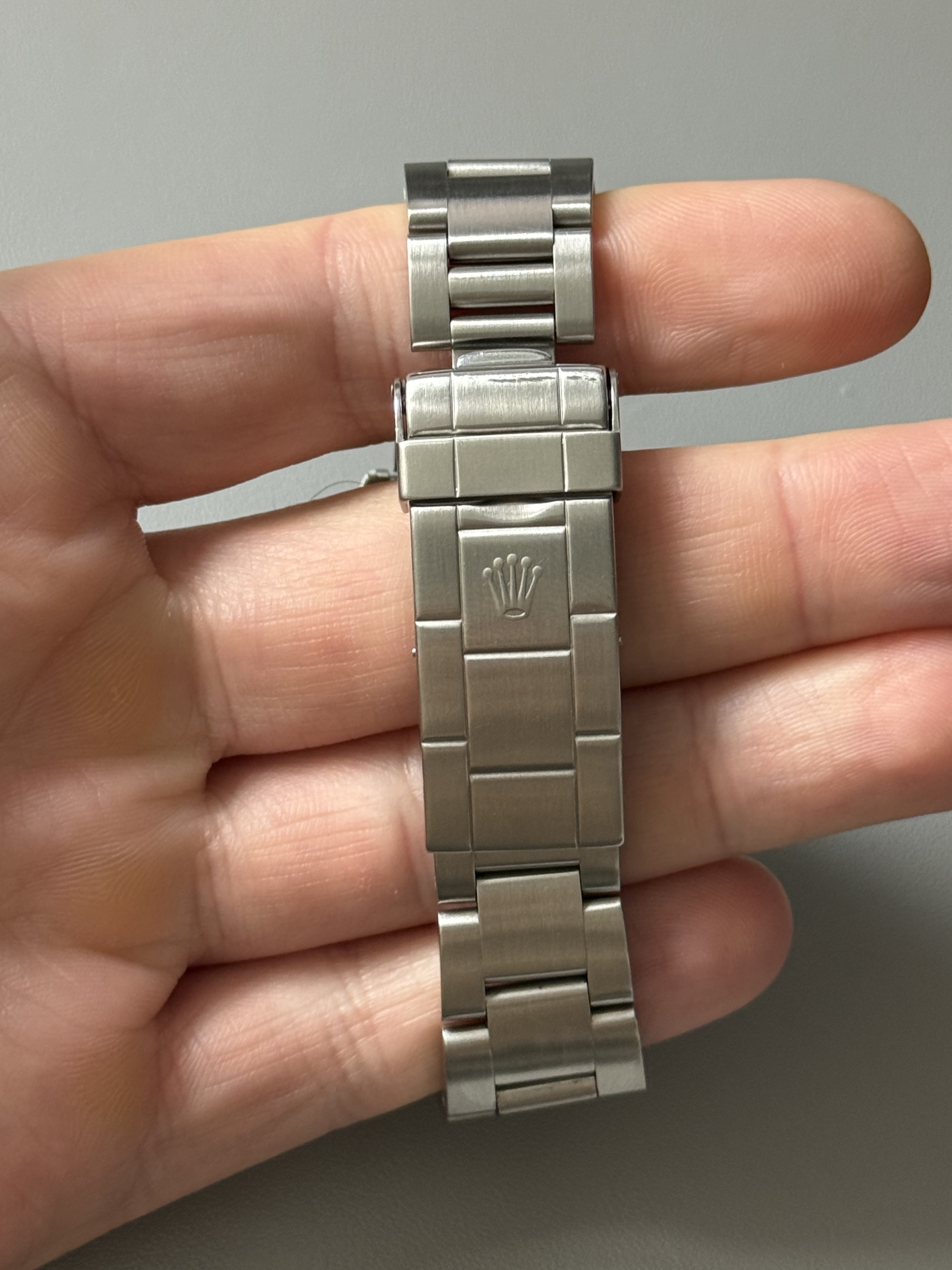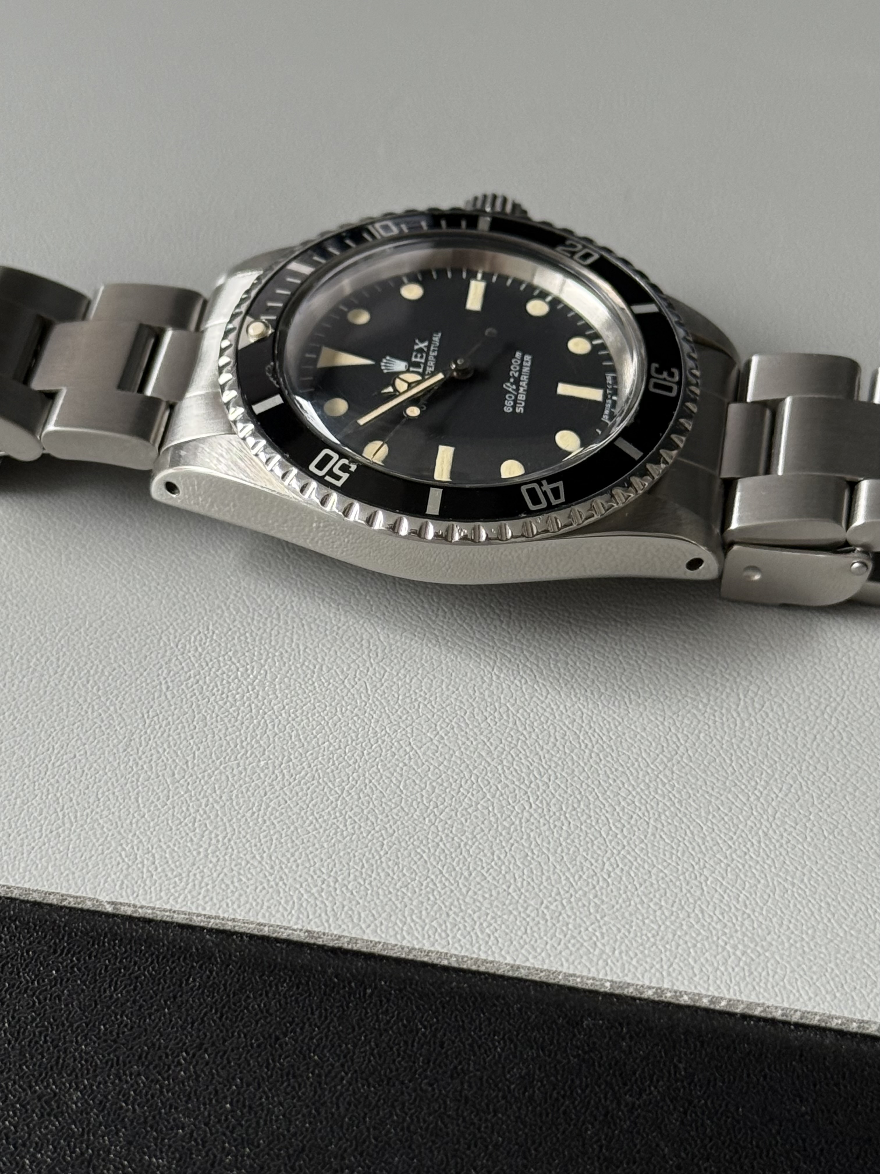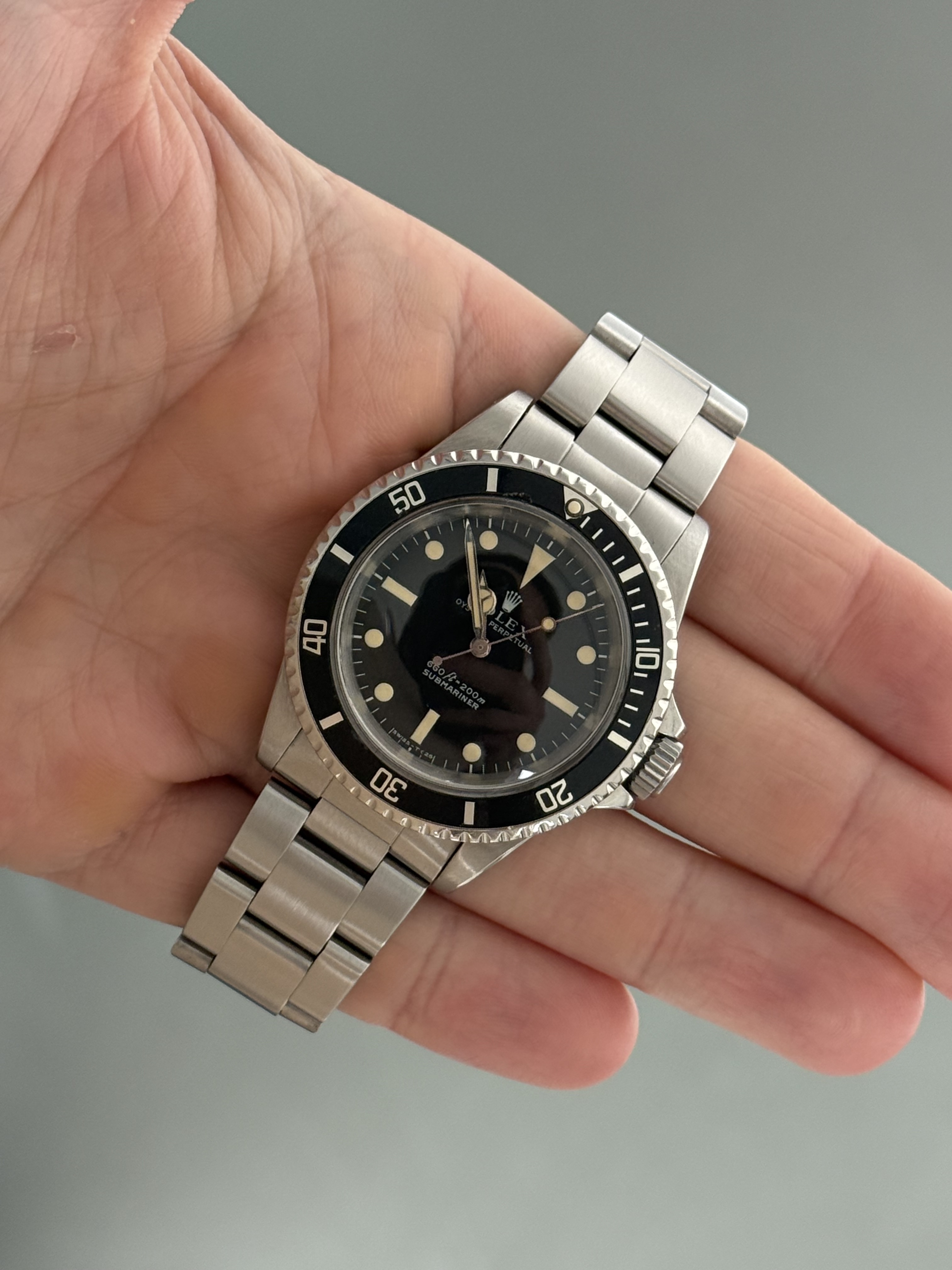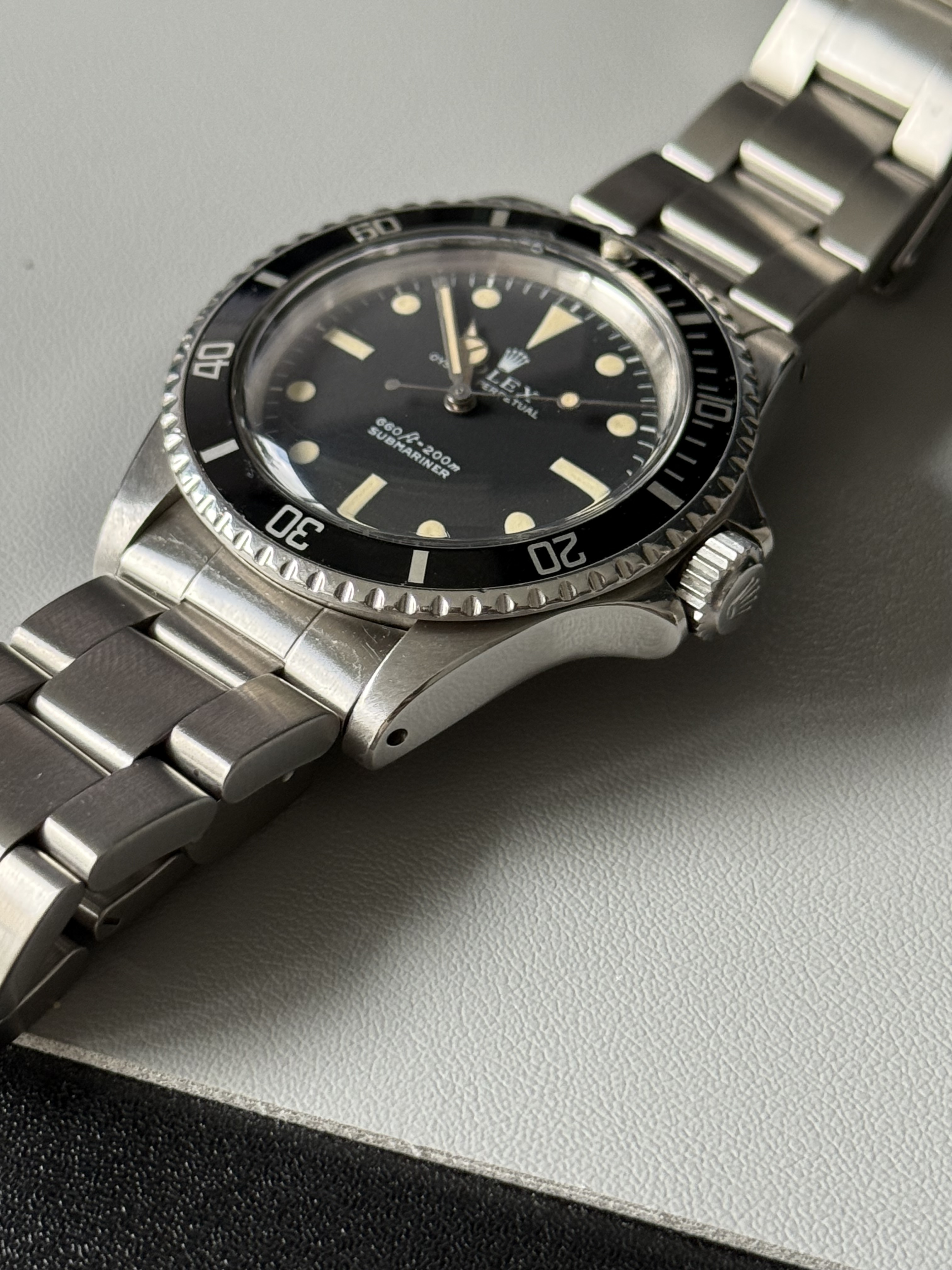 Het horloge heeft een prachtig originele patina op zowel de wijzers als de indexen. De wijzerplaat verkeert in uitstekende staat, zonder enige vlekjes of onregelmatigheden. De kast is mooi dik, zonder noemenswaardige deuken of krassen. De gemonteerde band is een latere, solide 93150, wat het horloge wat geschikter maakt voor dagelijks gebruik. De inlay is een zogeheten late 70’s – early 80’s midfont, met enkele gebruikssporen.