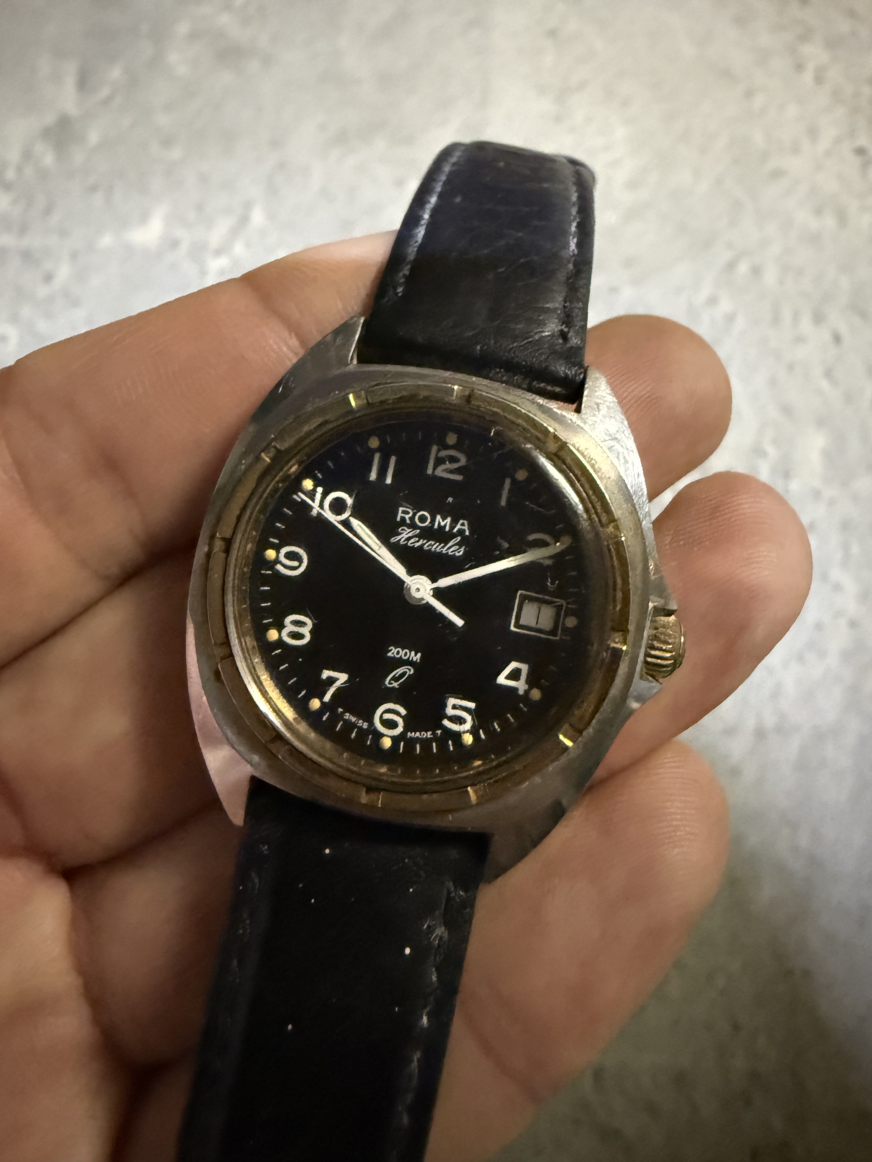 Dit is een Roma Hercules. Er staat 200m op de wijzerplaat geen idee hoe accuraat die bewering was in die tijd… De Hercules heeft heel wat “karakter”. Mijn grootvader was werkzaam in de bouwsector dus vermoedelijk was dit zijn werkhorloge.