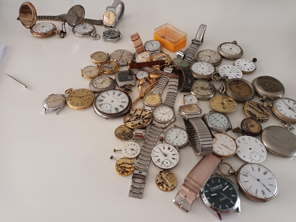 de grote berg troep is voor onderdelen: de zakhorloge onderdelentroep is voor een vriend die vooral zakhorloges en wekkertjes doet. ik breng dat altijd standaard mee om meteen door te geven als kadootje. De polshorlogetroep belandt hier ergens in de schuifjes
