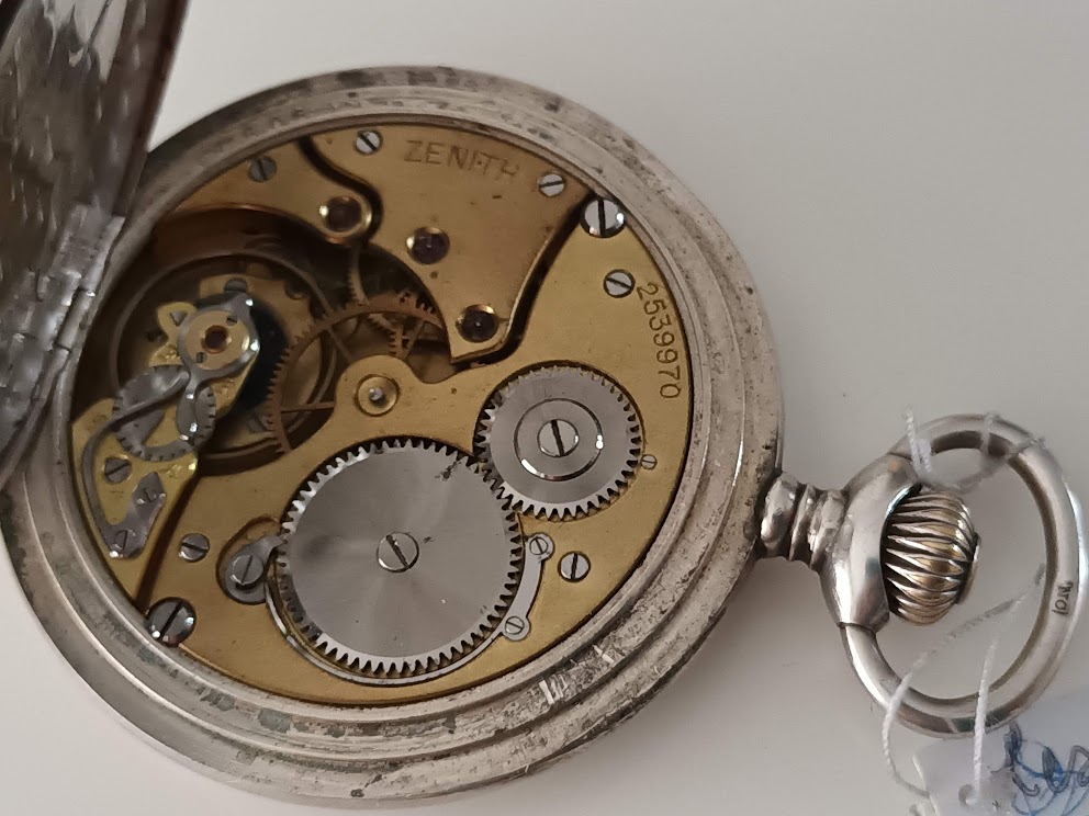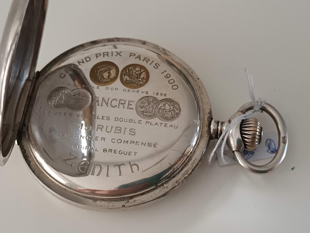 de mooiste - vind ik dan toch - een zenith chronometer savonette in zilver. Ook mooie zwanenhalsfijnafstelling, loopt ook op tijd en wat vind ik dat cool die savonettes met klepje vooraan. En dan vinden we er ook ineens 2, echt leuk.