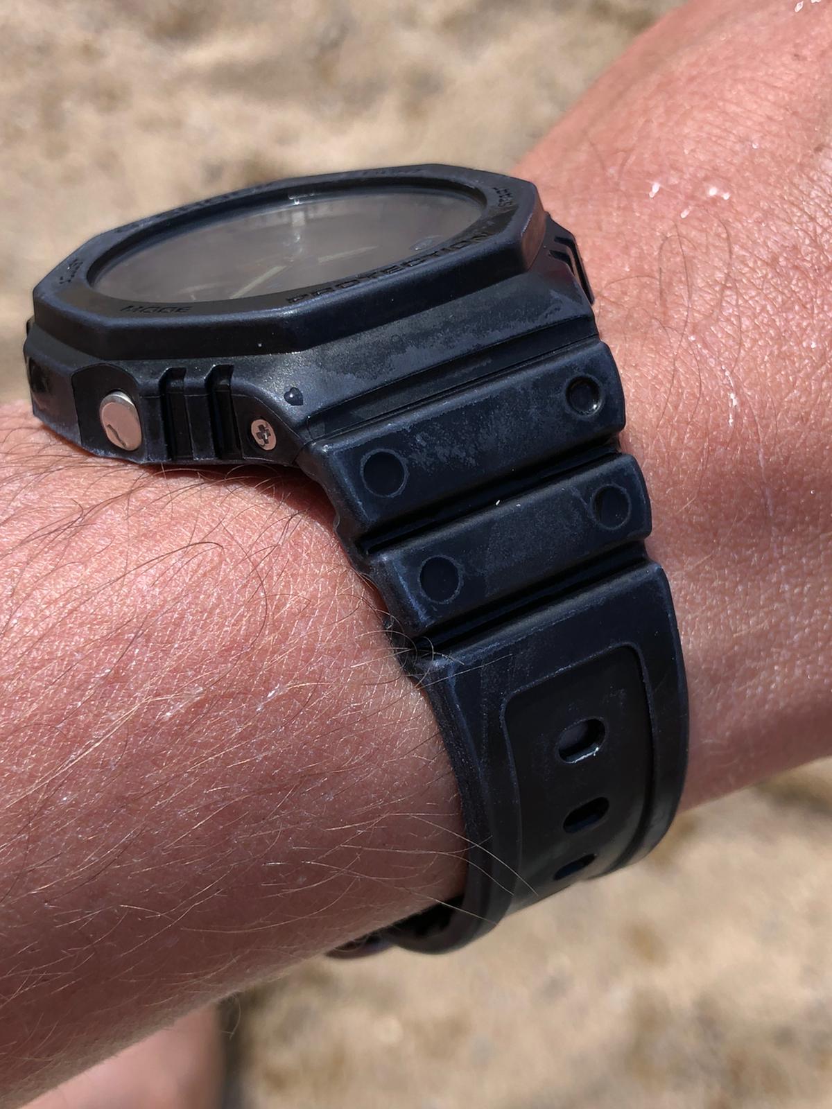 Mijn G-Shock GA2100 mee op vakantie. Heerlijk horloge, maar merk dat het plastic of rubber slecht kan tegen few combinatie van zon, zee en zonnebrand. Slaat helemaal wit uit. Bij thuiskomst gisteravond even met wat zeep en lauw water bezig geweest, maar de nieuwigheid is er al vrij snel af. Iemand tips hoe je zo’n rubberen/plastic band weer aardig mooi kunt krijgen? Anders gaat ie na afloop van de vakantie in de verkoop en haal ik een verse op…
