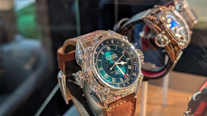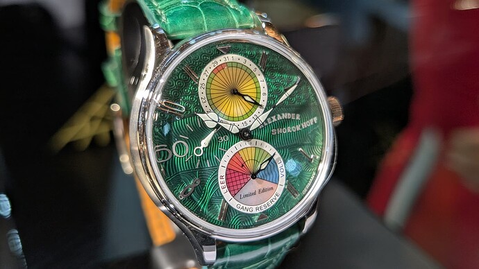 En dat was ook de bron van een grote teleurstelling; door het feit dat ze met custom “modules” bovenop hun (in een ver verleden Unitas-afgeleid) basis uurwerk werken om de verschillende mogelijkheden mogelijk te maken, zitten ze vast aan een grote diameter en veerton. En zijn hun creaties dus 42mm diameter, niet kleiner te krijgen zonder een complete re-design.
