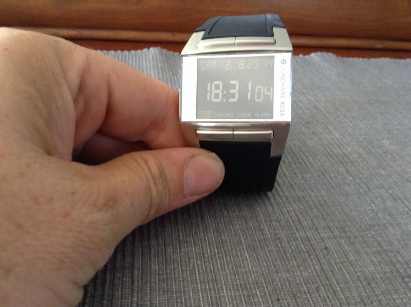 Ik heb reeds jaren een Junghans Mega 1000, die met zwarte metalen kast, rubberen band en zwarte display.
