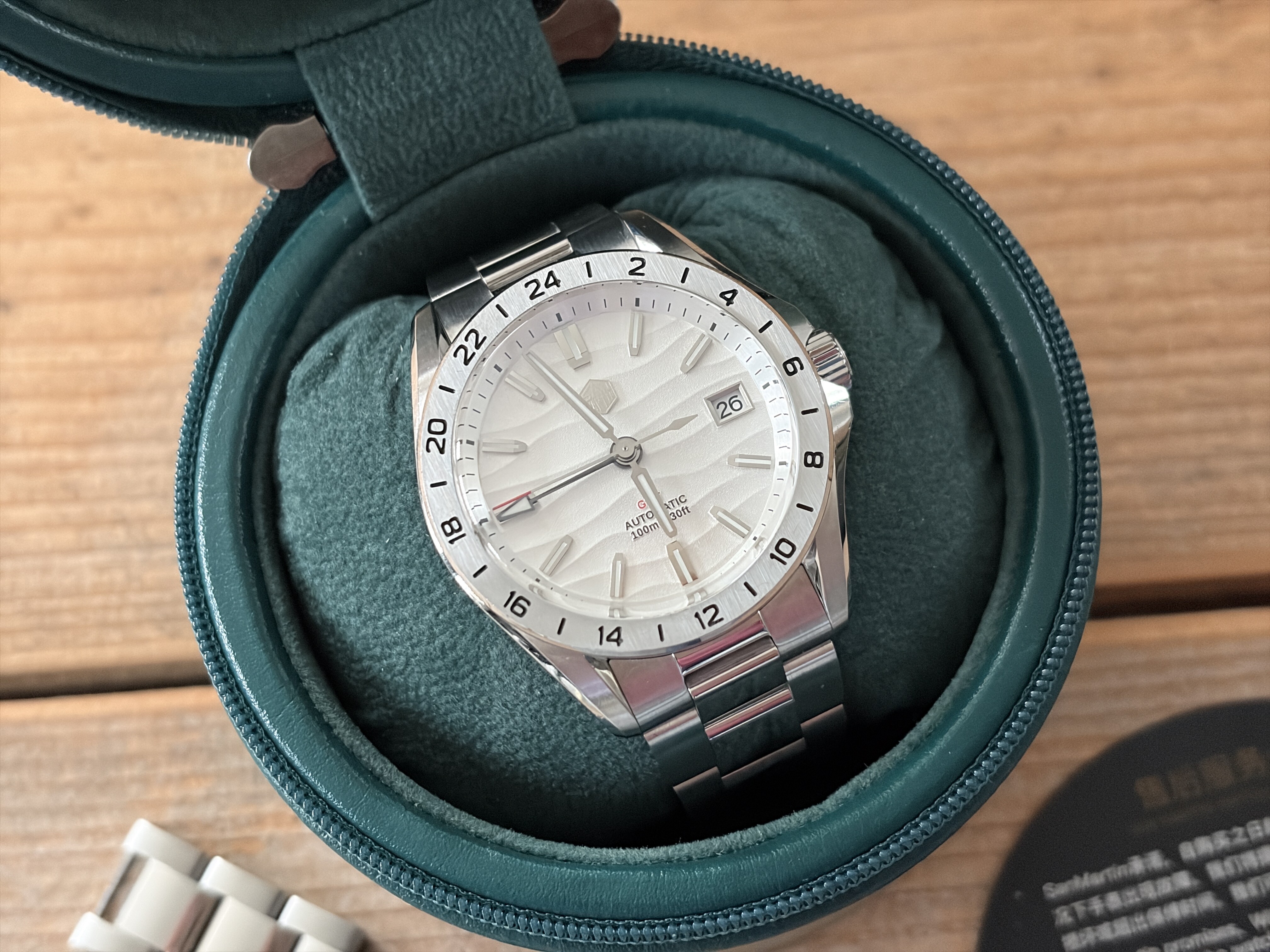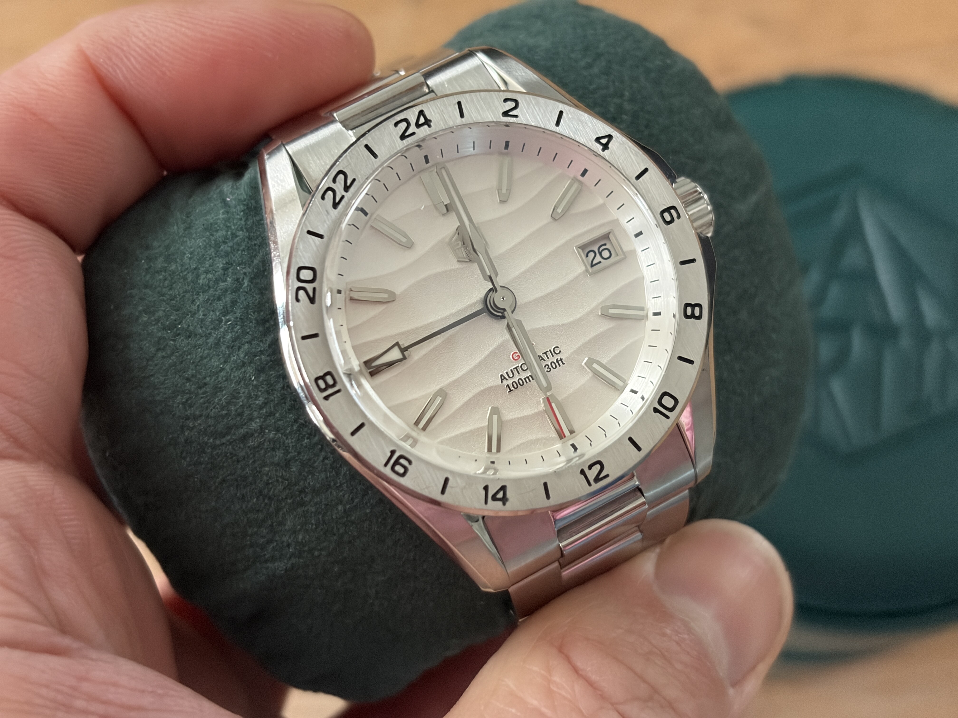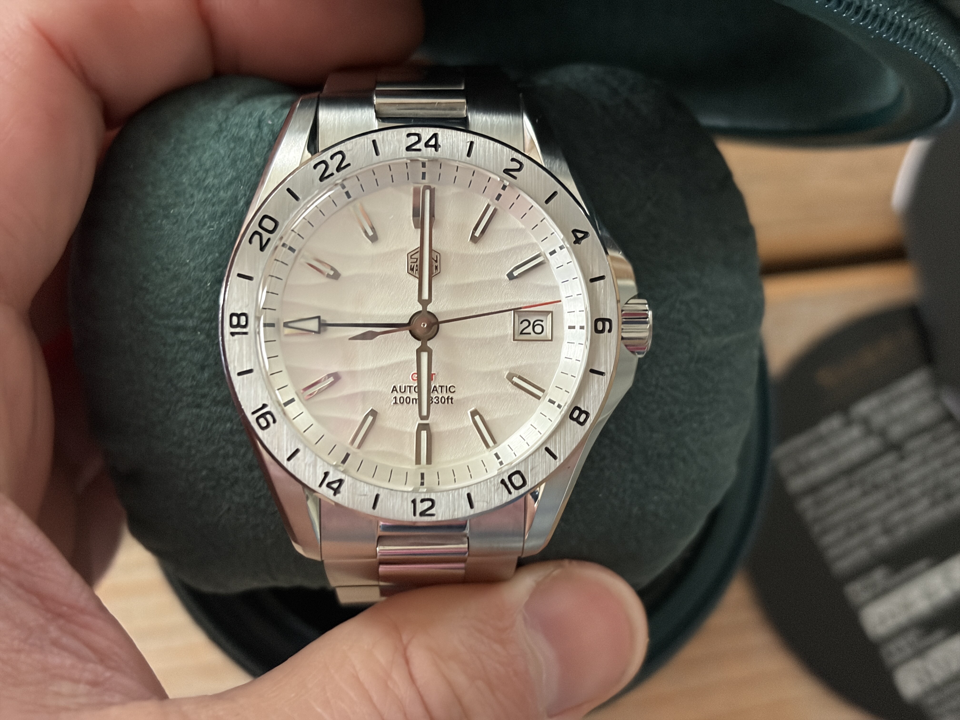 Merk en model: San Martin GMT - SN0129-G met wit / zilveren woestijn textuur wijzerplaat