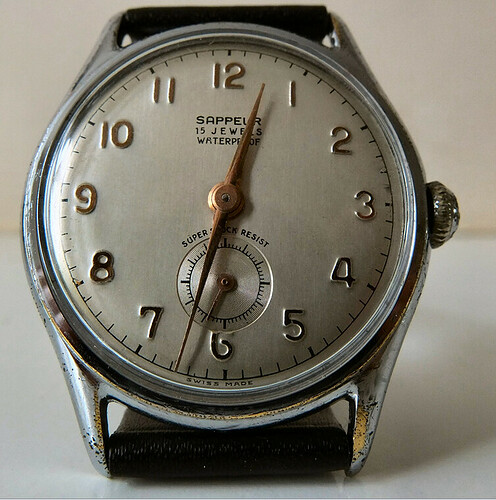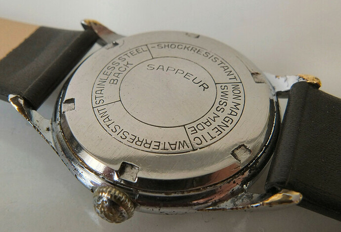 Recentelijk verwierf ik een lotje horloges uit Finland, waarvan één exemplaar het voor mij totaal onbekende merk ‘Sappeur’ op de wijzerplaat en de caseback had staan.