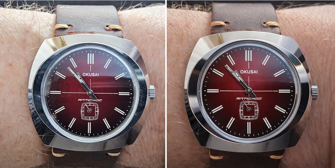 Vaak is er dan de aanleiding om het horloge dat om die reden gedragen wordt ook maar even te posten in het topic ‘Welke vintage draag je vandaag’. Daarnaast kwam ik gisterenmiddag in het topic ‘Toon je ‘weer levend gemaakte’ horloges ’ het al in de inleiding genoemde postje van @scudo tegen, waarin hij liet zien wat ChatGPT had uitgespookt met een foto van zijn Okusai horloge. Hier nog even beide versies van zijn Okusai naast elkaar: