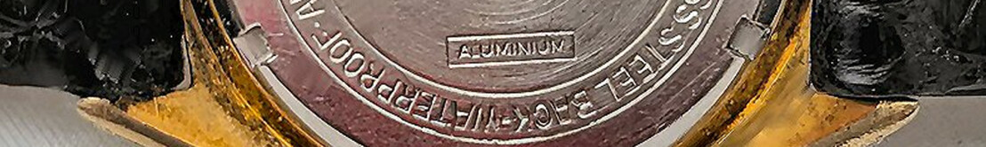 Tot mijn plezier en verrassing kwam het horloge van Bas terug, gemonteerd in een mooi artistiek bewerkt gold plated kastje, afkomstig van eveneens een Enicar horloge, waarvan het uurwerk te ver heen was om nog te kunnen repareren. Er was daar ook geen achterplaat meer van bewaard gebleven, maar de caseback van het originele aluminium kastje paste perfect. De inscriptie ALUMINIUM op die plaat is wat raar bij een base metal / messing goldplated behuizing, maar het herinnerde mooi aan het oorspronkelijke kastje.